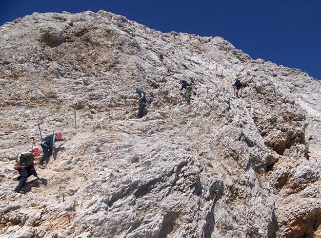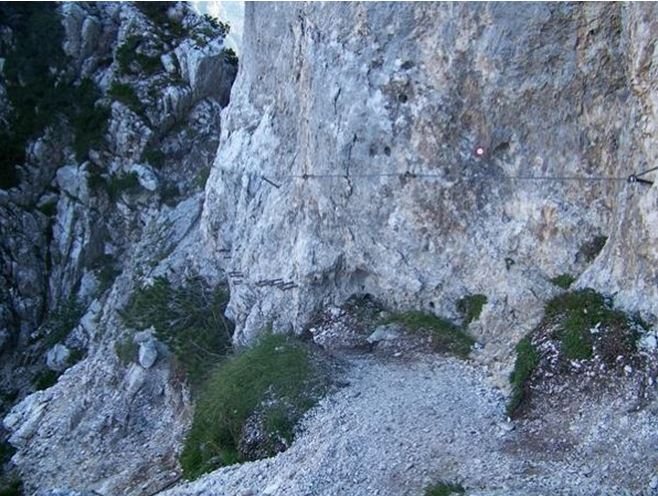 Čelada je že praktično obvezen pripomoček za hojo po zahtevnih in zelo zahtevnih zavarovanih plezalnih poteh, kot je ta, ki jo pravkar opisujem. Že divjad lahko sproži kamenje, medtem, ko pa pot tu mestoma cikcaka po steni in hitro se lahko zgodi da pred nami hodeči, nenamerno seveda, kaj sproži proti nam. To je tudi eden izmed razlogov zakaj je bolje oditi v gore zgodaj. Jaz se tega sicer nisem imel bati, ker sem bil tako ali tako med prvimi, večino tistih, ki pa so bili pred mano pa sem v naslednji uri prehitel.