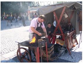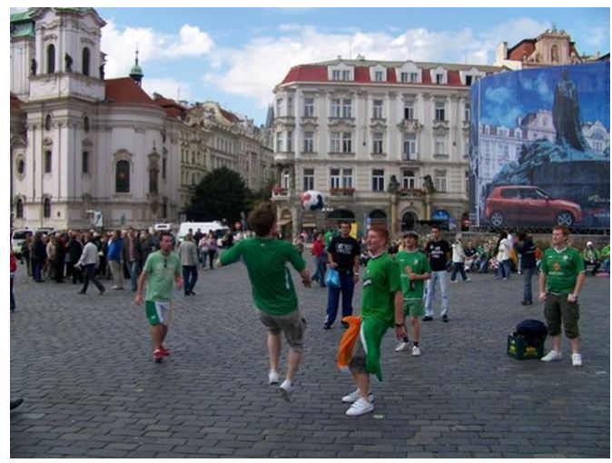 S parkirišča se najprej odpravimo do Staromestnega trga kjer si ogledamo zvonik z znamenito astronomsko uro. Ta prikazuje lokacijo Sonca, Lune ter zodiakalno znamenje. Na istem zvoniku pa je vsako uro mogoče opaziti tudi mimohod 12 apostolov. Ta dogodek si je prišla ogledat ogromna množica turistov. Na sploh pa sem bil presenečen nas turistično obiskanostjo Prage. Čisto nič ne zaostaja za Londonom, Parizom ali Benetkami. Le nekdo izmed njih pa se ni menil za slavne palače, mogočne cerkve ter katedrale. Šlo je za skupino Irskih navijačev, ki so kar sredi trga (popolnoma opiti) zaigrali partijo nogometa. Žoga je mnogokrat letela tudi proti nič hudega slutečim turistom.