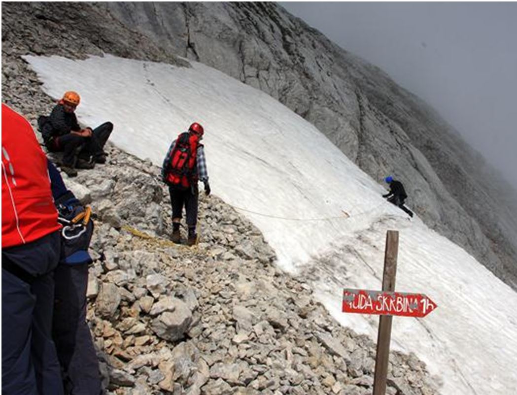 Najprej sem zbral vso opremo, ki smo jo imeli. 30-metrska vodniška vrv bo služila, kot glavna »jeklenica«. Malo me je skrbelo, če imamo s seboj dovolj vrvi. 30 m je kar malo, poleg tega pa smo imeli še okrog 18 pomožnih vrvic različnih debelin v skupni dolžini okrog 60 m. Z njimi pa je bilo treba varčevati zaradi njihove nujne uporabe na vseh vmesnih varovališčih. Za začetno sidrišče se je s plezalnim kladivom zabilo v skalo izven snežišča 2 klina, vanj vponki, ter skozi ti obe še neskončna zanka v katero sta prišli še dve matičarki. Ena je služila kot sidrišče za mojega pomožnega vodnika ter druga za moje varovanje v kombianciji s polbičevim vozlom. Vmesna pritrdišča v snegu sem izdelal s pomočjo zložljivih pohodnih palic. Z alpinističnim kladivom sem izkopal luknje v obliki črke T. Vanj se je zakopala palica na katero sem s kavbojskim vozlom privezal neskončno zanko. Na pritrdišče sta sodili spet 2 vponki. Enak postopek sem ponovil še na dveh pritrdiščih in na končnem varovališču. Za izdelavo vrvne ograje sme potreboval skorajda eno uro. Da pa ostalim udeležencem med tem časom en bi bilo dolgčas si je med tem časom inštruktor zlomil še roko, ki jo je bilo treba oskrbeti. Za tako ograjo potrebno tudi kar nekaj opreme, ki jo en sam težko nosi. Zato je prav da vodnik da vdeti udeležencem kaj je obvezan oprema in zakaj se jo nosi v gore. Izgubili smo torej dobro uro časa. Veliko boste rekli? No kako veliko v resnici je to sem spoznal takoj na licu mesta. Med tem ko sem jaz izdeloval varovala sta na snežišče priletela dva Češka kolesarja v navadnih tekaških copatih. Čehinji se je odtrgal manjši plaz kamenja. Tako da je obstala v strmini. Tresla se e od strahu. Bi pa se še mnogo bolj, če bi vedela nad kakšnim prepadom se nahaja. Pogled nanj je preprečevala vedno gostejša megla. Njen partner ji ni znal pomagati. Zato smo jo morali rešiti mi. Oba smo napotili naravnost v dolino. Še pred tem pa sta povedala da sta podobno potencialno izzivala svojo usodo in ogrožala življenje gorskim reševalcem na Triglavu. Kaj je torej ena izgubljena ura, v primerjavi z izgubljenim celotnim življenjem.