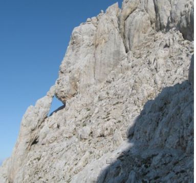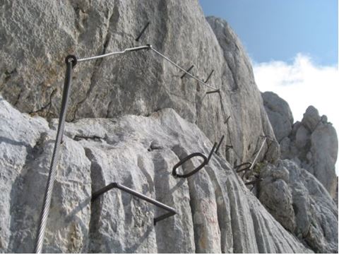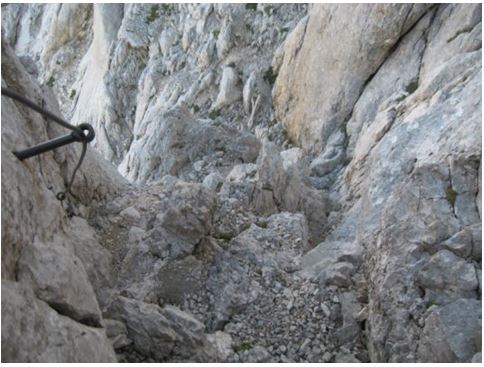 Po melišču zelo dobro napredujem in končno prehitim še vedno dvigajočo meglo. Tu se držimo nekoliko bolj desno, da pridemo na zelo zahtevno zavarovano plezalno pot. Še sreča, da sem bil iz megle. V nasprotnem primeru bi imel mnogo več težav najti začetek poti. Pot je prvih 15 minut enaka po težavnosti in po konfiguraciji, kot pot s Planike na Mali Triglav. Lahka, a z veliko nerodnega ter nestabilnega grušča. Potem pa gre proti vzhodu po naravnih prehodih.