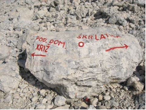 Nadenem si čelado, saj se po njem čez pot valijo metrske skale! Pospešim, saj nočem jaz kake uloviti. Tu je drugo razpotje na poti. Krenem desno navzgor po melišču. Leva pot pripelje čez Križ na Kriške pode.