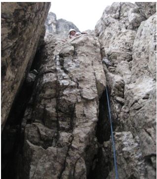 Že prvi raztežaj je nekoliko težavnejši in sva se že za začetek varovala. Po tem odseku kar nekaj časa ni pravega plezanja. Vrv nama je samo v napoto. Skala se nama proti Macesnom zelo kruši. Potem pa pot pripelje do Belih plati. Gre za edino nekrušljivo in gladko steno v tem pobočju. Oprimkov je zato malo in sama smer bi bila naravnost čeznje precej zahtevna. Na srečo je na skrajno desni strani plitek žleb po katerem se da plezati brez težav. Potem naju je čakalo spet nekaj minut hoje, katero nam je oviralo nenehno motanje vrvi. Na vrsti pa je bilo verjetno najtežje mesto smeri – 5 m visok skalni skok.