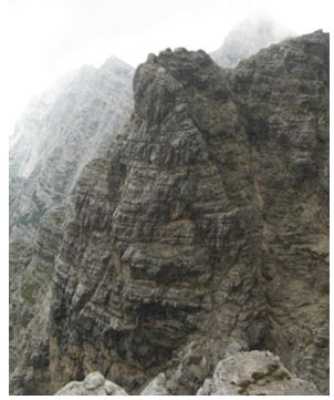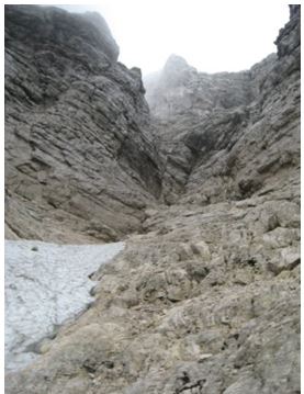 Zgornji del Slovenske grape. Slovenska smer gre po dnu grape proti temnejšim skalam skozi Okbo.
