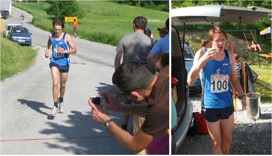 Trasa proge naredi poln ovinek okrog cerkve sv. Matere božje, kot da bi nam jo organizatorji hoteli razkazati. Ne, pa res ni časa z ogledom. Ovinek je oster. Trenutek nepozornosti z zatopljenimi mislimi in gleženj se mi je spet zvil. Sledi pa še huje- strm spust. Konkurenca se je do tu razdelila. Razred zase so bile Zupančič, Bregar in Pintar. Midva z Urošem Bertoncljem slediva vodečim in počasi vse bolj zaostajava. Tu pa še Uroša čisto pobere. Sam sem si od tod naprej prisiljen diktirati tempo na vročem asfaltu. Hudičevo težko! Pot ga na srečo kmalu zapusti in prijetno pelje ob regulirani strugi Selščice. Še en krog je pred mano. Konkurenca mi je tako ušla, da si mislim, da sem zašel s proge. Še vedno živijo v meni neprijetni občutki z Dražgoške gore in Udin Boršta. Joj, tako je težko, pa da tečem še narobe … Na srečo ne. Fotografski objektivi me v cilju pričakajo, prav takšnega, kot sem pričakoval – nečloveško izmučenega. Prvič se mi je zgodilo, da mi je še po prihodu na cilj šlo na bruhanje. Z zimsko! kapo, ki sem jo dobil ob plačilu štartnine, bi lahko pokril svoj izmaličen obraz. Zmagovalna trojka ni odnesla kaj bolje, saj tudi ona hladi svoje glave pod drevesom.