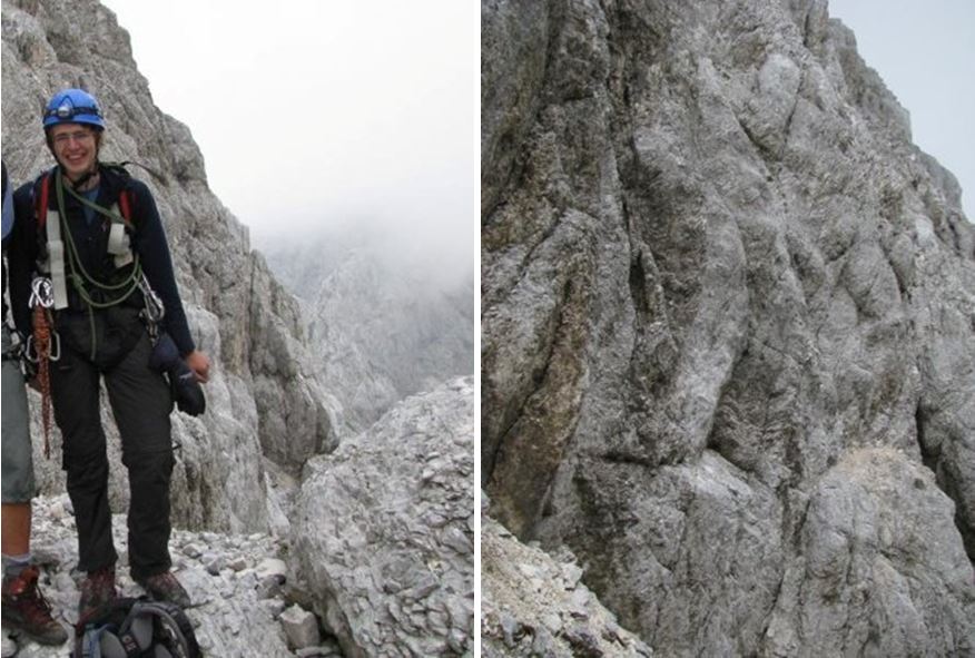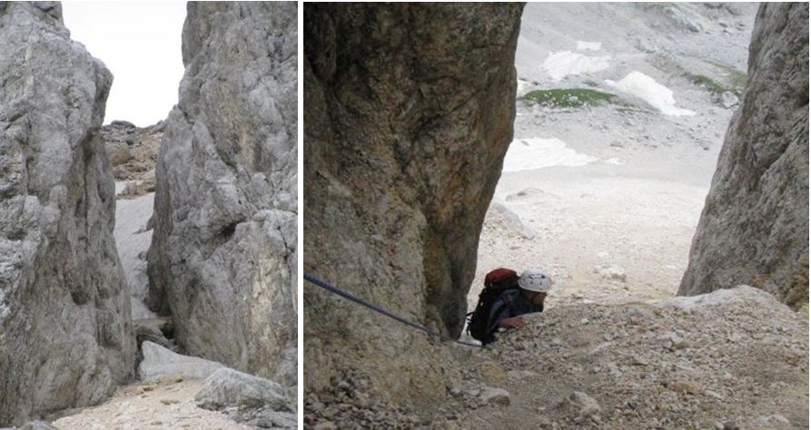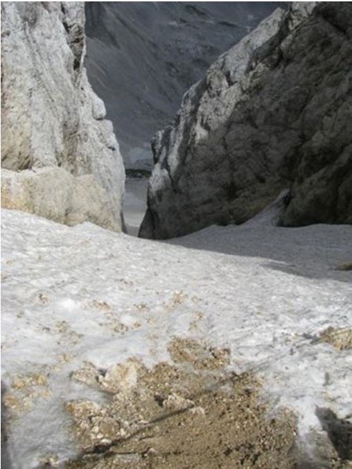 Prvi pogled v ozebnik preseneti, da je še na debelo zalit s snegom. Čisto spodaj se snežišču izogniti po krajni zevi. No skoraj – jaz sem se zataknil. Sledi skalen skok, čez katerega se je sneg očitno, kot čez ledeniško grbino že odlomil. Čez splezam brez potreb po varovanju, potem ko s hrbta končno odložim 15 kilogramov težak nahrbtnik, ki me vleče nazaj iz težišča. Edina težava je res velika krušljivost. Ampak to krušljivost v pravem pomenu besede! Skale so se prožile spontano, brez pravega razloga, celo nad mano. Mogoče pa navsezadnje držijo zgodbe o tem, da zgolj kričanje “skalo ruši”. Nad skokom je zabit klin v katerega so zavezani trakovi za spust po vrvi.