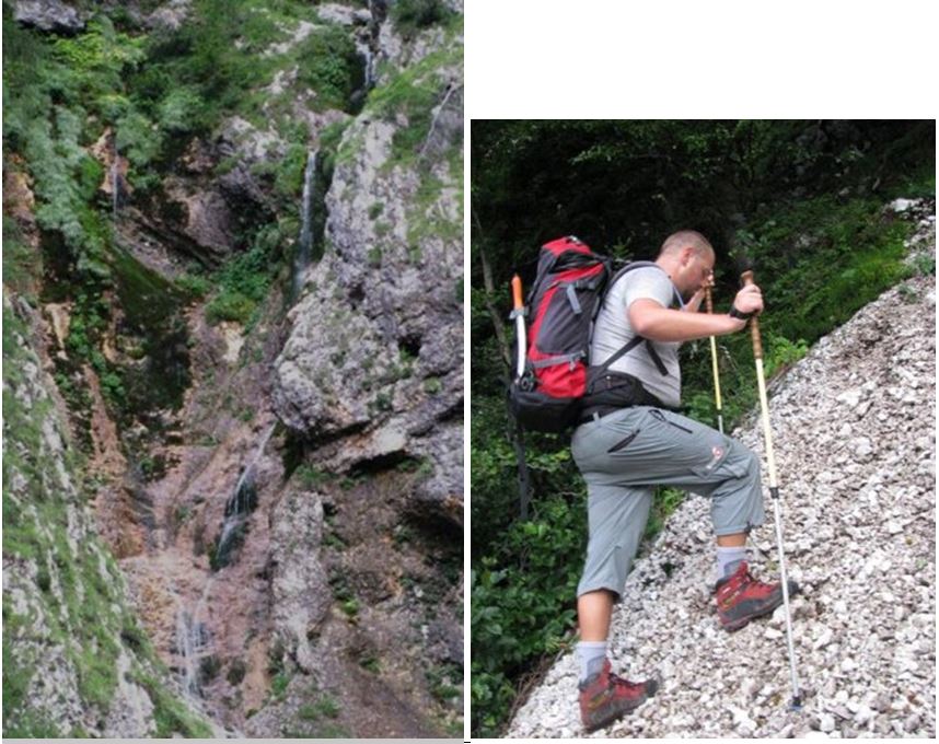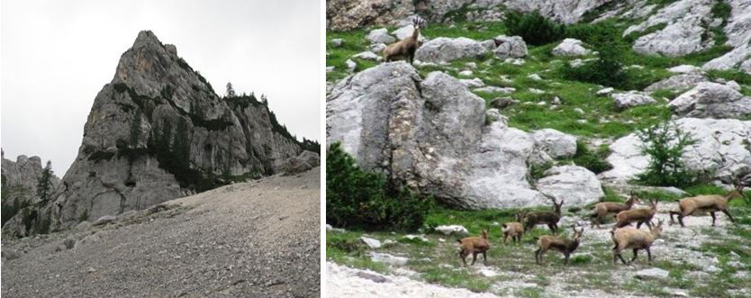 Tu, že tako nenavadno nizko, se začnejo melišča. Kalvarija! Sploh za dva hrbta, ki tovorita vso mogočo plezalno in zimsko opremo. Melišč ni konca do stene Rokavov. Občasno pa se jim da izogibati s hojo po gozdu. Pot kar nekaj časa sledi levi strani potoka, potem pa ga preči z desnim ovinkom pod stenami, da se izogne skalnemu skoku, kjer čez rdečo skalo teče slap. Še nekaj meliščanja nazaj v grapi in sva nad gozdno mejo. Prikaže se trikotna gora- Mali Matterhorn. Pod njima pa velika čreda gamsov, ki mi uide kljub naporom, da bi jim prišel bližje (samo fotkati sem jih mislil, ne plašiti).