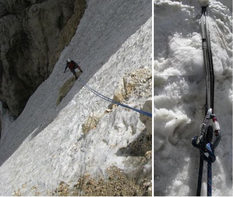 Najprej običajen spust do skale. Za tem pa še spust s pomočjo polbičevega vozla na T-sidrišče v snegu (kot vidite je bilo vrvi ravno dovolj)