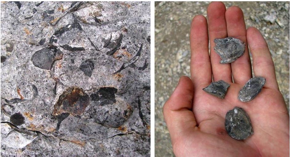 Grebenski apnenec pa vsebuje tudi ogromno fosilov. Predvsem gre to za školjke iz rodu Trigonudus ter pomembnejšo Myophorio Kefershteini, ki jo imenujemo tudi vodilni fosil, saj če najdemo njo vemo da smo naleteli na kamnine karnijske starosti. Ta školjka je bila po vsem svetu razširjena samo v času karnija, potem pa je hipno izumrla. Na bližnjem najdišču smo našli na stotine okamnelih lupin školjk. Žal pa so bili le redki fosili kvalitetni in dobro ohranjeni.