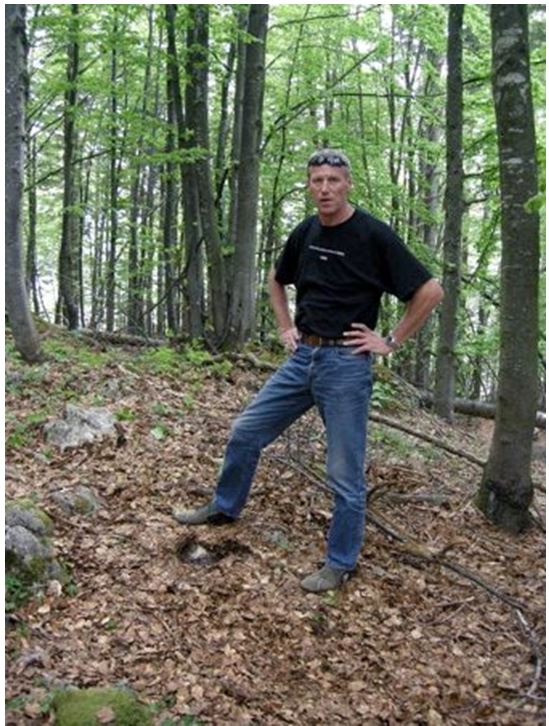 Najditelj meteorita Jožef Pretnar iz Spodnjih Gorij ob udarni jami 19. maja 2009. Foto: Miha Jeršek