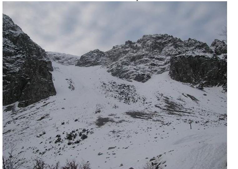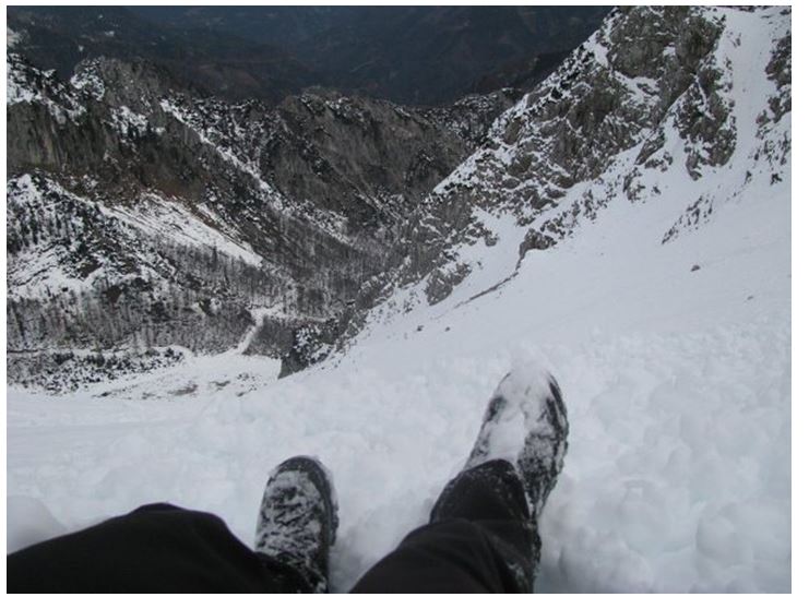 Snežna meja se je začela le 5 minut hoje nad mejnim prehodom. Gaz je bila pomrznjena do te mere, da je bila hoja brez derez komajda mogoča. Pri Koči na Zelenici sem se usmeril na plaz pod Centralno grapo. Ampak ni šlo nikamor, ker sem se do zadnje plati vdiral v sneg. Pravzaprav sem se moral za vsak korak izkobacati iz snežne pasti.