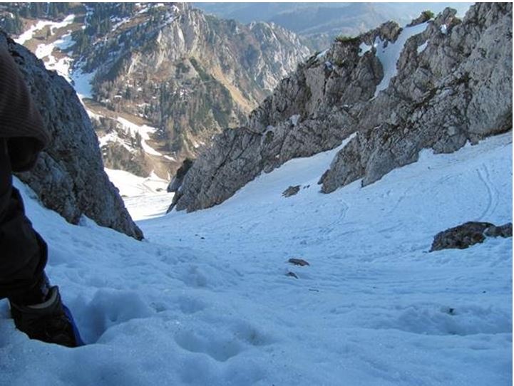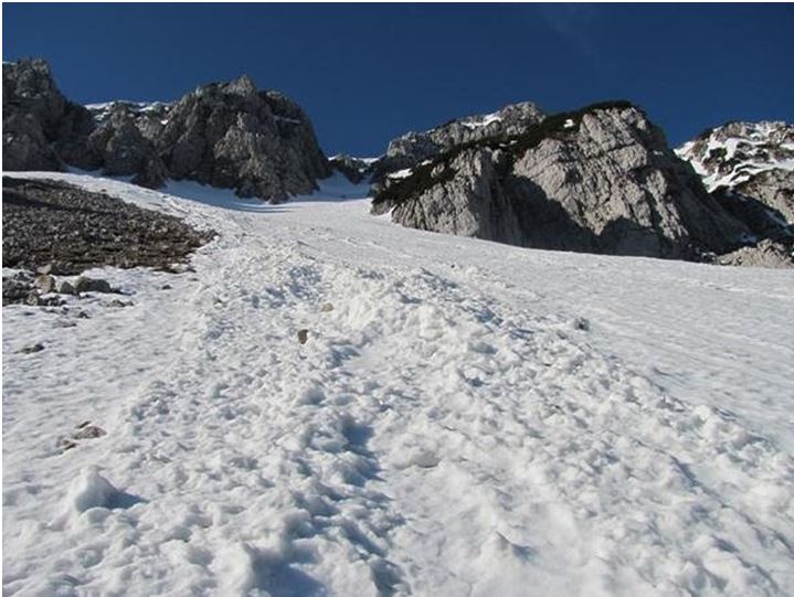 Gaz čez melišču v Osrednjo grapo je bilo na srečo že narejena. Po njej sem lahko hodil kot po stopnicah.