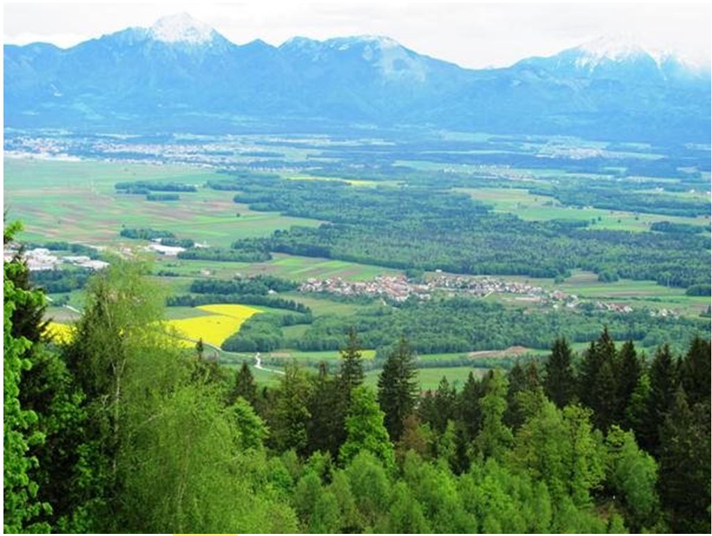 Pogled na pomlad z Osolnika, v ozadju pobeljene Kamniško – Savinjske Alpe
