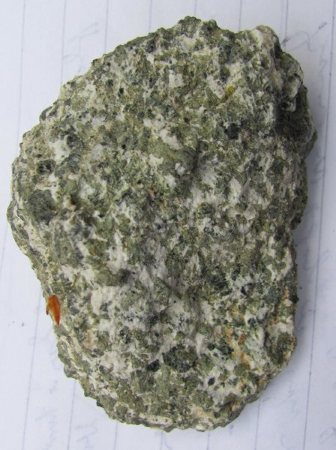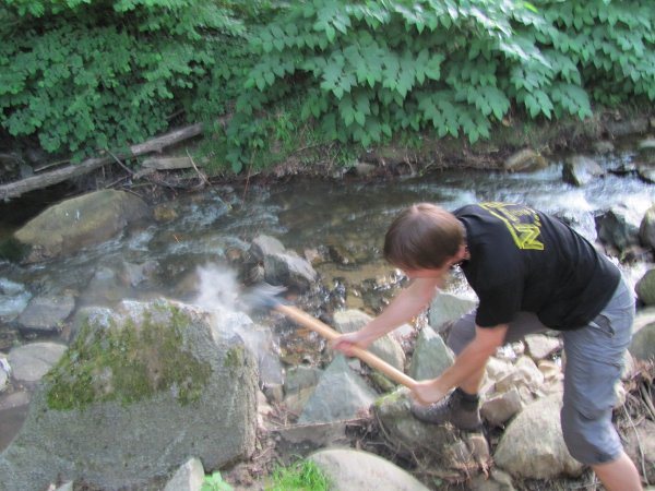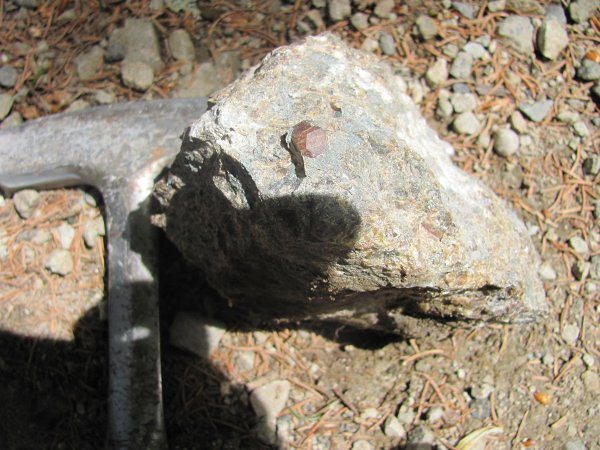 Balvan granatovega peridotita se je uspešno upiral razbijanju z macolo. Iskre so letele na vse strani, dovolj velikega vzorca pa kljub temu nismo mogli odbiti.