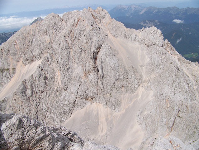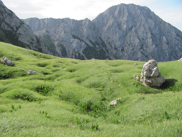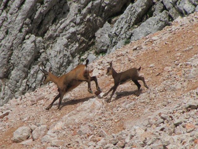 Za tem se po obsežnih meliščih začel vzpenjati proti Kokrski Kočni. Kalvarija z eno besedo! Že dolgo se nisem tako namučil s hojo, mogoče je le še gaženje snega bolj naporno. Višje, od zgoraj pa sem še od čreda gamsov dobil pošiljko skal. Čelada je obvezna, saj je vse zelo krušljivo. Sploh potem ko se rešimo melišč je še pol ure hoje po skalnatem terenu, ki zna biti nevarno za zdrs, ker je na skalah naložen droben grušč.