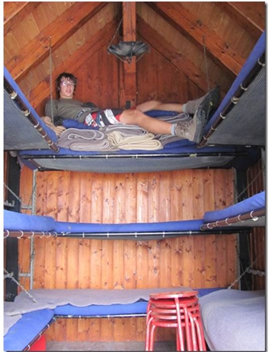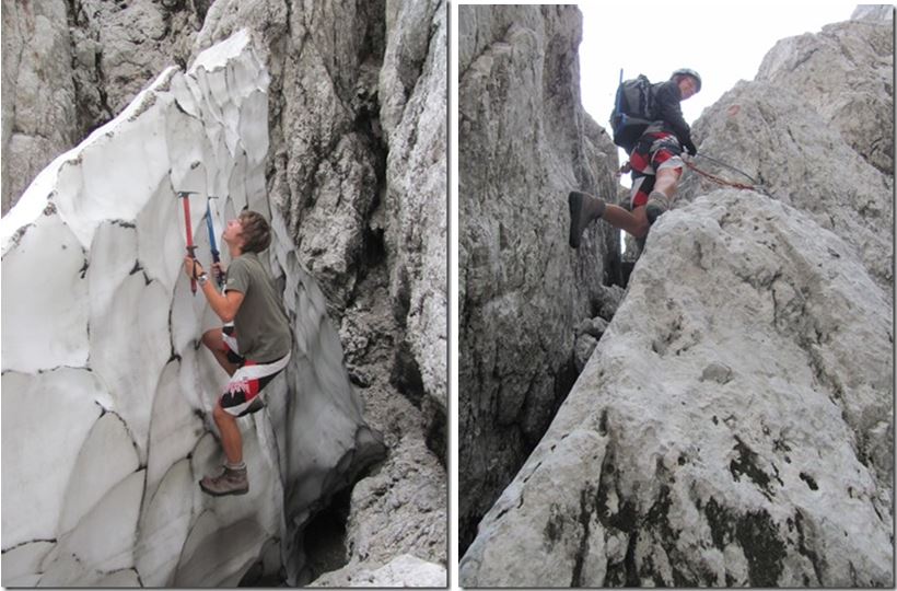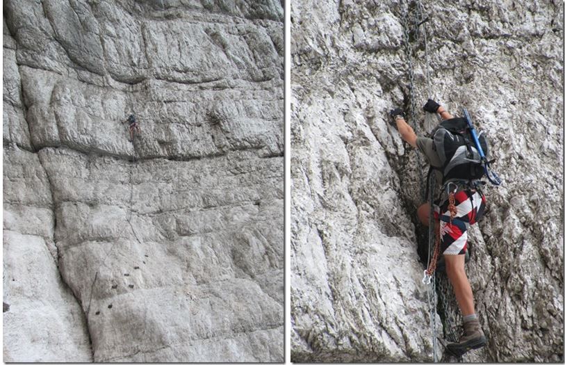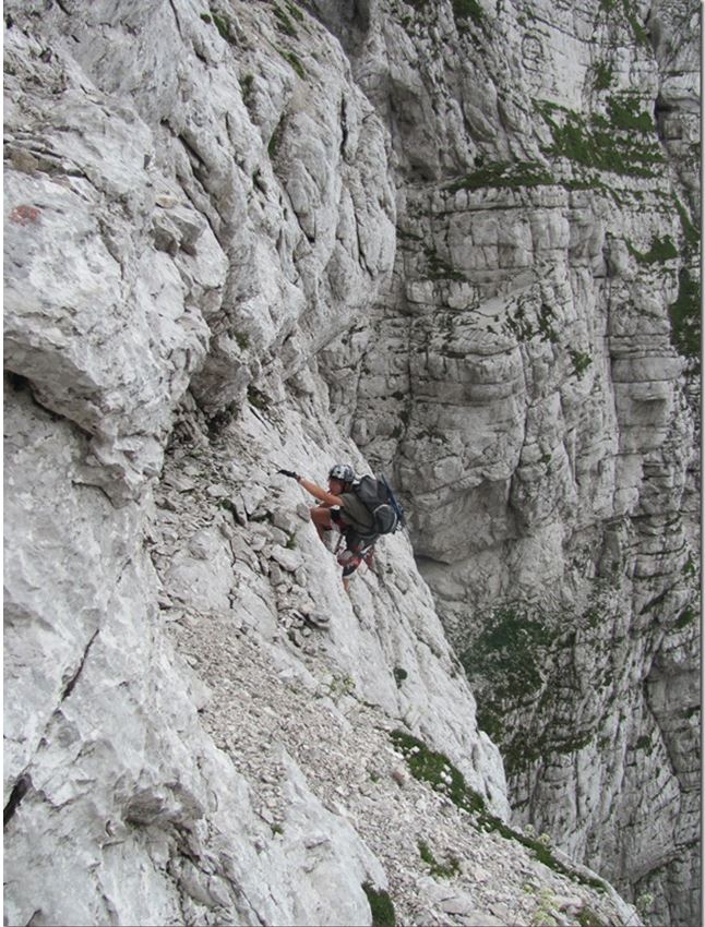 Za tem pa spet postane bolj zanimiva, saj zavije navpično navzgor. V pomoč je poleg jeklenice tudi veriga, ki je dovolj tanka da se da v njo še vpenjati. Dela za roke kljub navpičnici vseeno ni veliko, saj je skob dovolj. Po tem bolj ali manj navpičnem delu, je jeklenic spet konec. Tokrat po mojem mnenju povsem neupravičeno. Težavnost tega dela po mojem mnenju obsega plezanju prve do druge težavnostne stopnje. Ob tem da je vse zelo nevarno za zdrs, ker je povsod naloženega veliko drobnega grušča. Rdeče pike vodijo vsepovprek čez steno in težko je reči da ima “pot” eno konkretno smer. Nekje zgoraj na desni se že kaže rdeč bivak Tarvisio, a sprva pike vodijo čisto v nasprotno stran. Ob tem plezanju, ki ga ni malo (pol ure) sem že mislil da sva zalutala na kakšno alpinistično smer. Res je treba biti previden, ker je marsikje precej izpostavljeno. V megli pa bi se bilo tu znajti (videti rdeče pike) res zelo težko. Glej ga zlomka! Malo pred bivakom Tarvisio se jeklenice (tu pa po nepotrebnem) zopet pojavijo. Oh, res ne razumem te poti.
