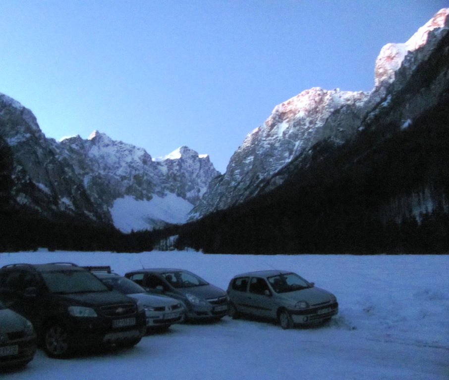 Obveščen sem bil da je pri Kovinarski koči spluženo parkirišče le za nekaj avtomobilov. Zato sem s seboj vzel kramp in lopato, če bi bilo slučajno treba skopati novo parkirno mesto. Nisem pa vedel da je cesta v Krmo tako slaba. Ponekod so kolesnice v snegu tudi 10 cm globoke. Avta niti ne vozim jaz, ampak po snežnih kanalih (nevarno) slalomira kar sam. Zaradi poledenelega vozišča priporočam da imate za vsak slučaj s seboj tudi snežne verige. Na srečo sem vsaj pri Kovinarski koči dovolj zgoden, da mi ni treba kopati še parkirišča.