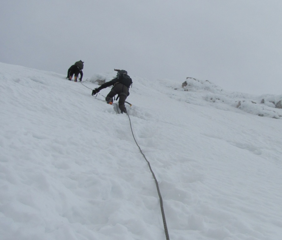 Končno smo se začeli vzpenjati navzgor proti Jalovškemu ozebniku. Zaradi odjuge se je sneg prediral (do gležnjev). Občasni sunki vetra pa so stare gazi že zamedli. Medtem ko smo se mi vzpenjali, se je počasi zdanilo.