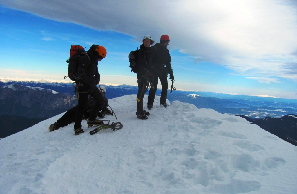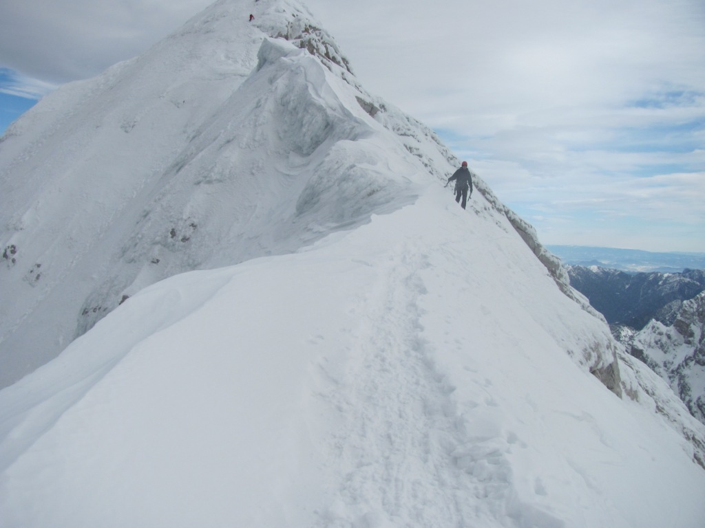Sestopamo previdno in počasi, ker vemo da je to najbolj nevaren del vsake ture. Vendar ne nazaj čez strm Zimski kamin, ampak po normalni smeri, ki sledi poteku letne poti. Izpostavljen grebenski del poti nam ni povzročal preglavic.