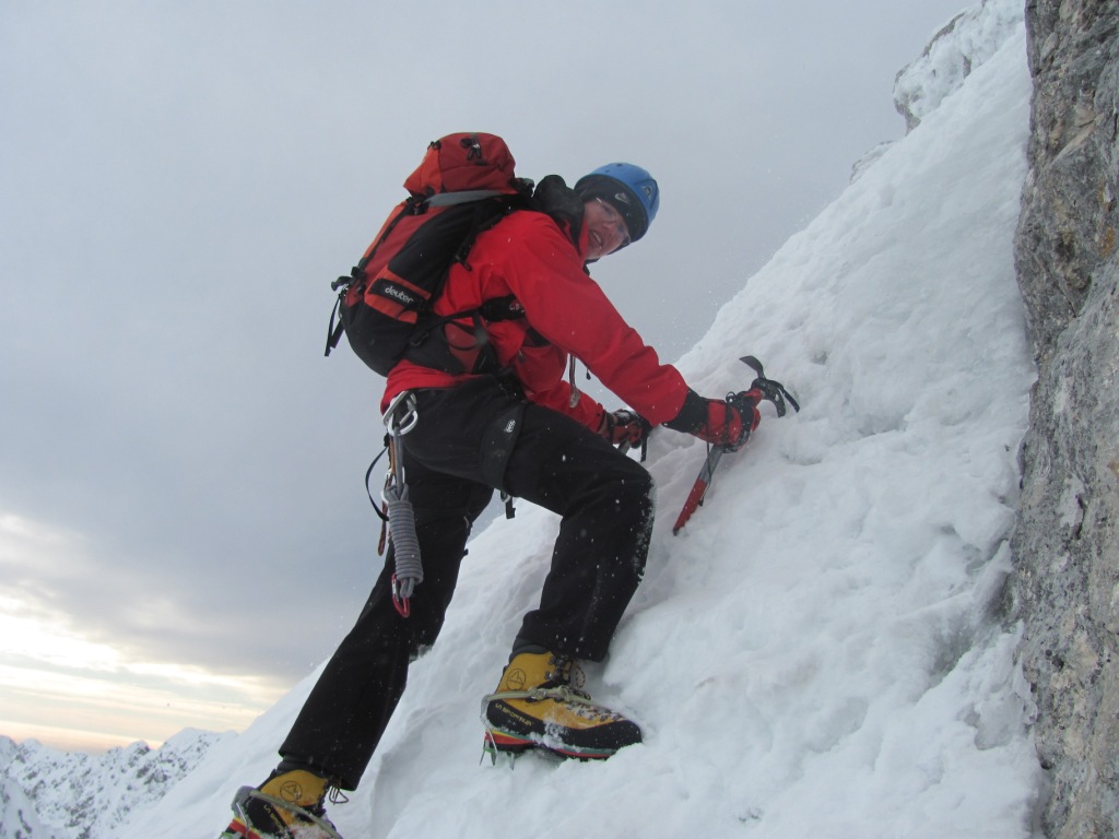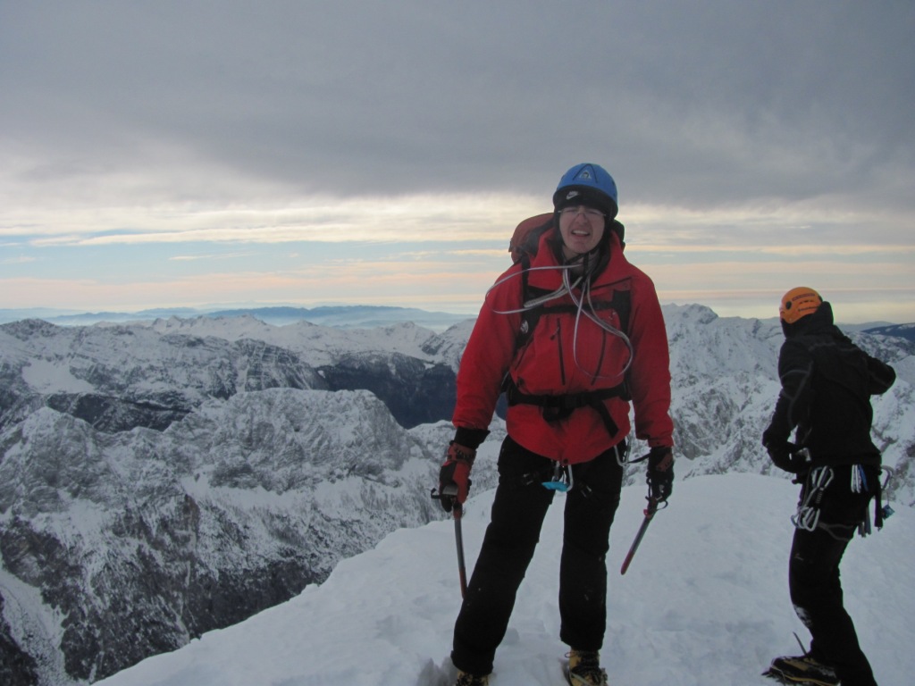 Na vrhu počakam kolege da nadaljujem vzpon na vrh Jalovec. Odločili smo se za vzpon skozi Zimski kamin na Streho Jalovca. Začetni (20 m visok) skok v smeri je precej strm (okrog 70 °). Na srečo pa je bil odlično zalit in zaledenel, tako da so bajle in dereze dobro prijele. Višje na strehi se strmina za kakih 10-20° strmina unese. Težav ni več, razen krajše, malce bolj izpostavljene prečke v desno (seveda prostora za napako tu nikjer ni). S strehe smo stopili na greben Jalovca in se po njem v nekaj minutah vzpeli na vrh gore. Na vrhu je močno pihal veter in s seboj nosil ledene kristale, ostre kot britev, ki so se zažirali v naše brade. Zato se na vrhu zadržimo le toliko časa da si čestitamo in da naredimo nekaj fotografij. Razgled je čudovit!
