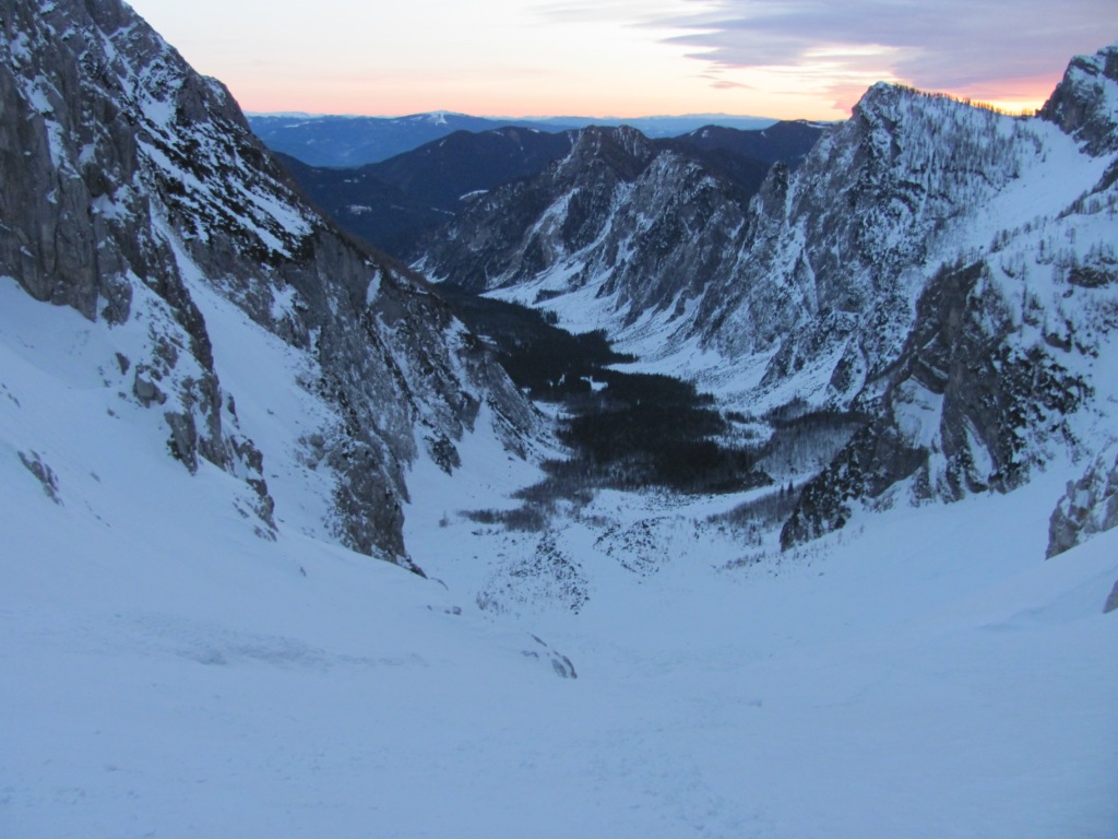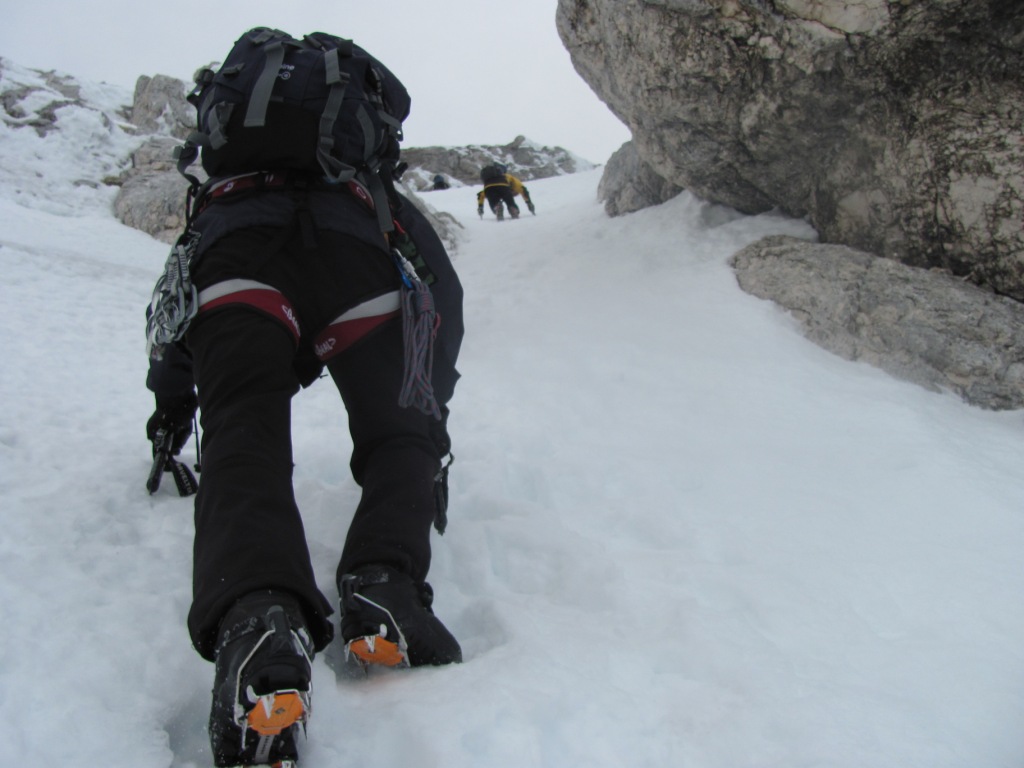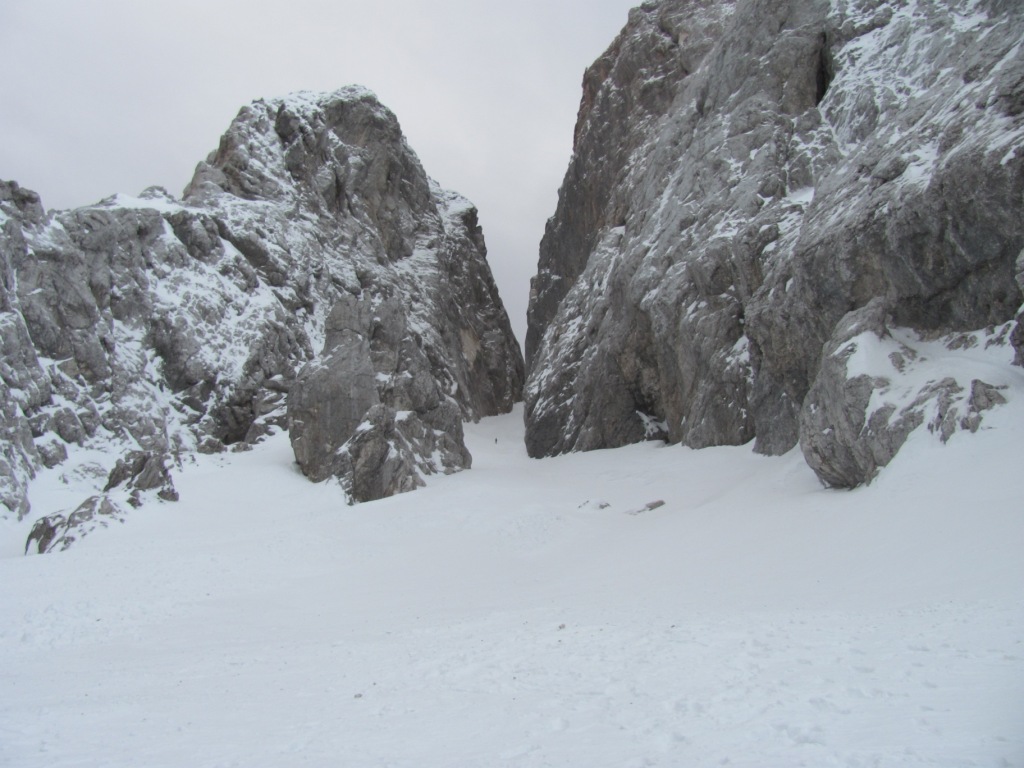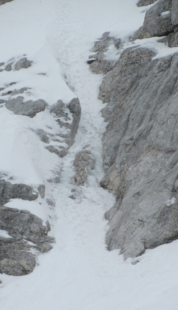 Pač pa smo imeli težave kasneje, ko se smer dobrih 100 višinskih metrov spušča naravnost navzdol. Tako smo bili kake pol ure sestopa vsi gorniki ves čas točno drug nad drugim. Ravno nekaj minut za nami sta po istem pobočja začela sestopati še dva Italijana. Ni nam jasno kaj točna sta počela, ali sta v sneg morebiti kopala nove canale. Vemo le to da jima je pri tem uspelo sprožiti za cele manjše plazove snega, ki so nas “prijetno” tuširali in bombardirali še cel nadaljnji sestop dokler … dokler nas ni rešila prečnica v desno (sicer najbolj zoprn del poti) proti začetku Ozebnika.