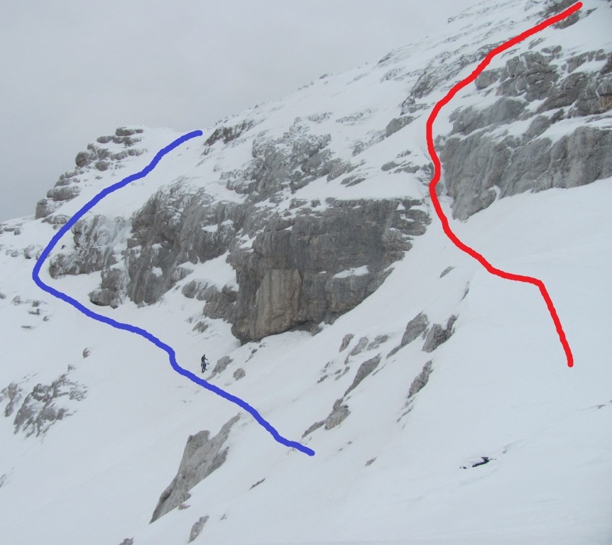Rdeča črta kaže smer vzpona čez Zimski kamin (slika desno), modra pa smer sestopa