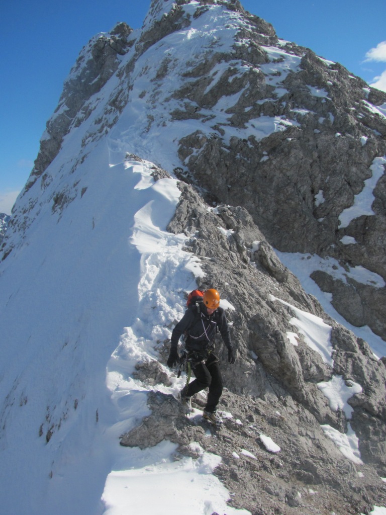 Na najinem današnjem grebenu je bilo povsem drugače. Sneg se je tu in tam predrl do pasu, vendar večinoma pa je bilo skorajda popolnoma kopno. Začela sva na sedlu Čez pod in jo krenila na zahod. Na prvega izmed (štirih) Mož sva se povzpela čez deloma kopen skok in pa njegovo strmo vzhodno steno (III). Juš me je lepo pozihral, tako da je bil ta del zame užitkarski dry-tooling. Sestopila pa sva s pomočjo spusta po vrvi, ker je bila sestopna grapa premalo zalita (le poprhana s centimetrom snega).
