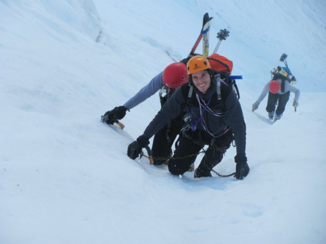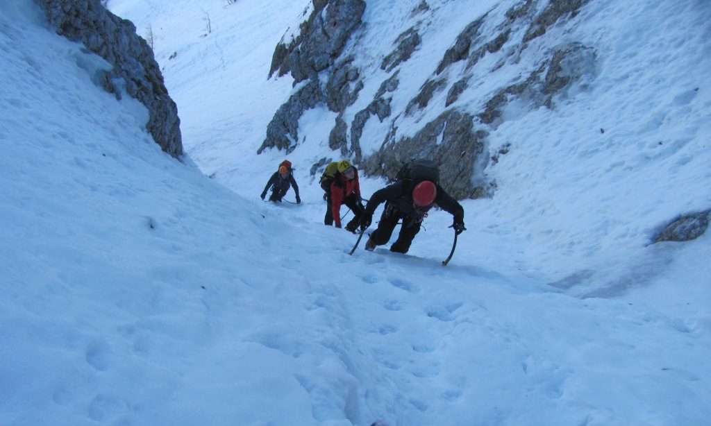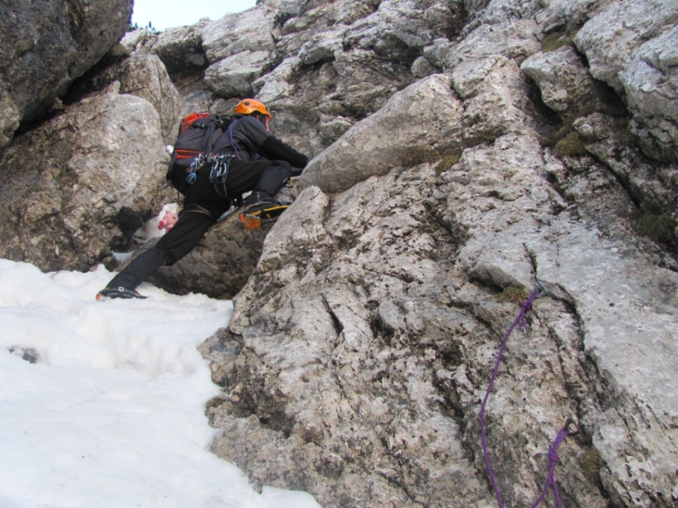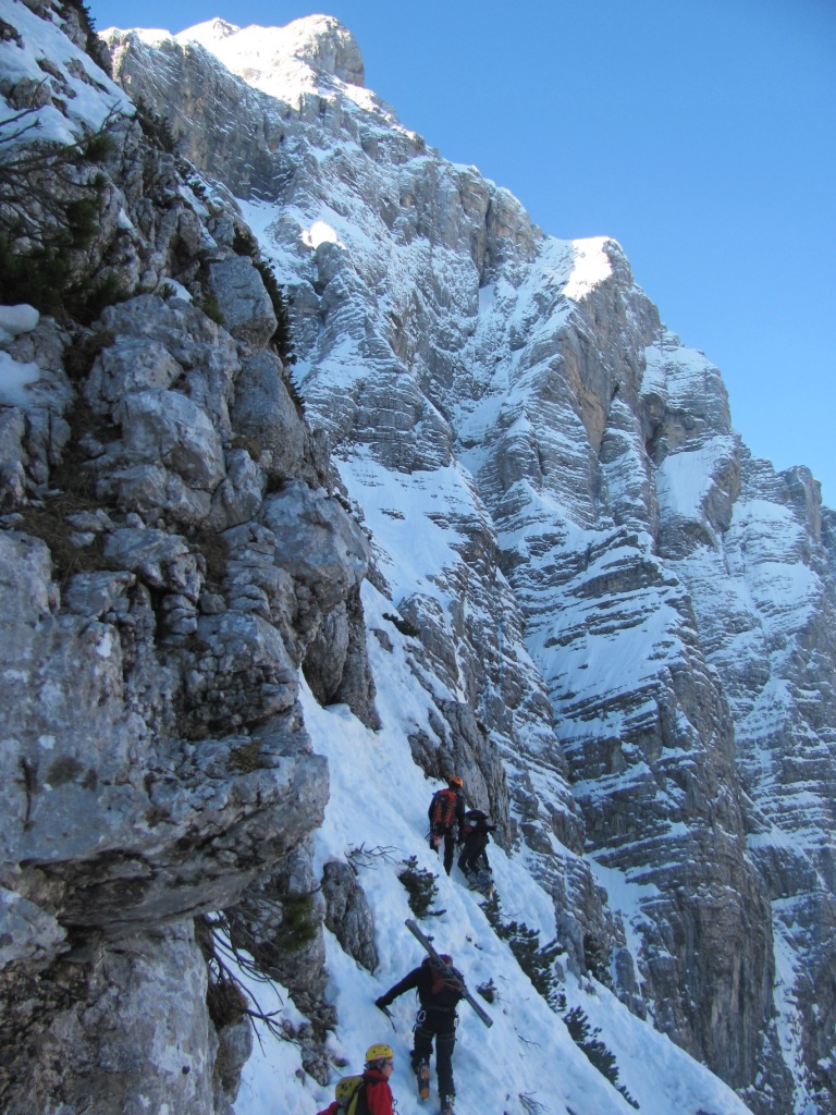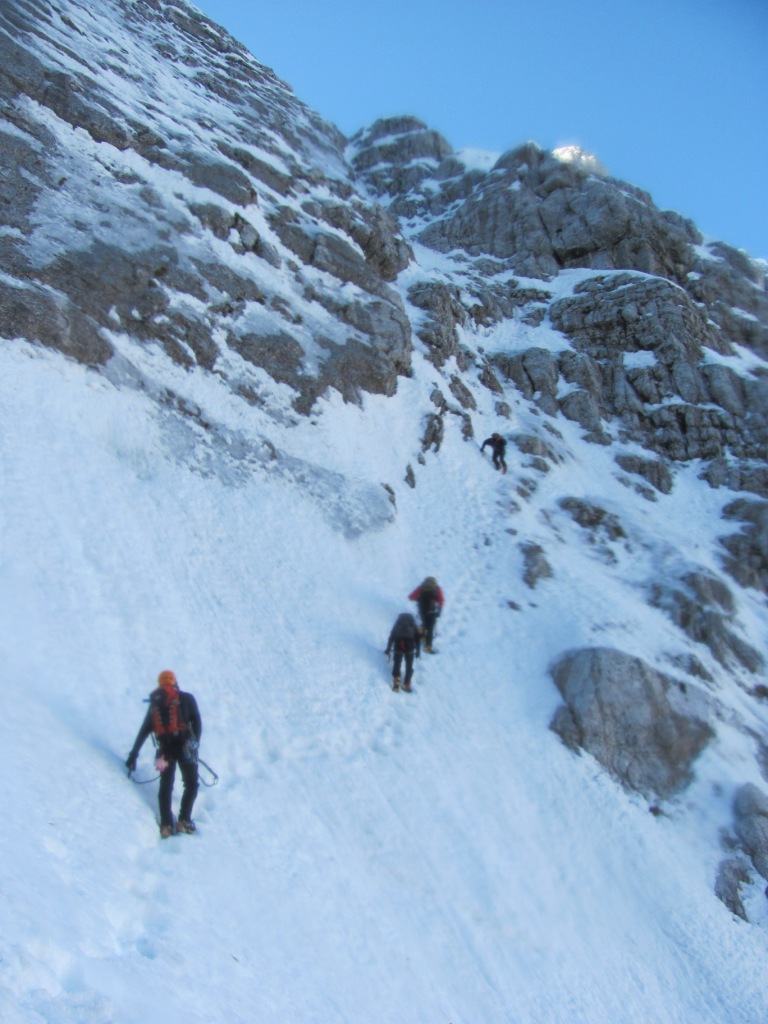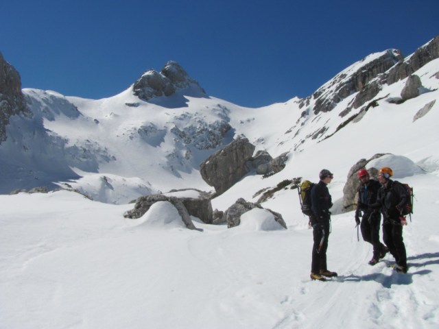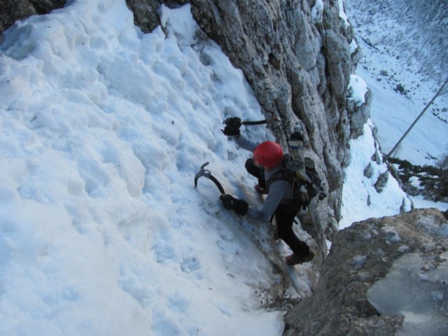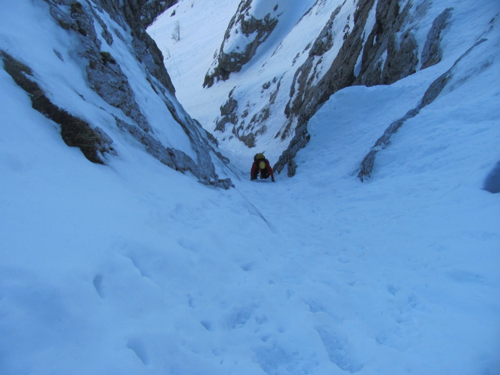 Sledile so Bele plati, kjer je bilo treba preplezati nekaj zaporednih slabše zalitih skokov. Vendar nismo imeli težav, ker je bil sneg tu že bolj trd in leden.