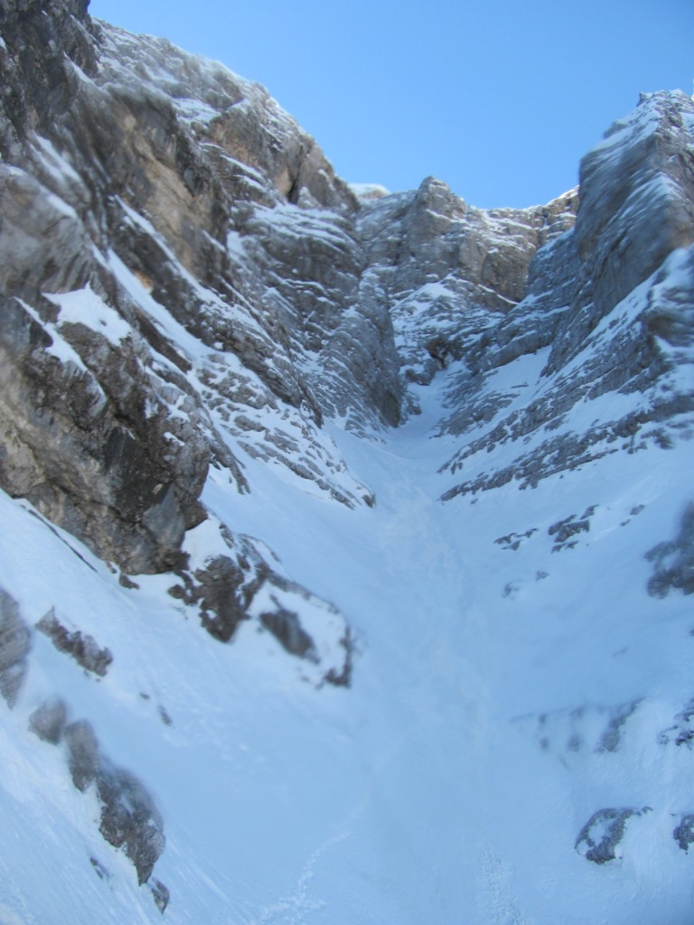 Še zadnji pravi skok v smeri je sredi Bučerjeve grape. Ostalo pa je vzpenjanje po bolj ali manj strmih grapah. Nič več me ne preseneča da so to smer že večkrat presmučali. Naslednja na vrsti med grapami je bila Slovenska grapa. Z nje je lep pogled na Zlatorogove police. Sredi grape smo se odcepili levo v Prevčev izstop iz smeri, ki pa je bil popolnoma zalit. Niti enega samega skoka ni. To je lep del smeri, visoko nad dolino, z odlično pikarijo in norimi razgledi .