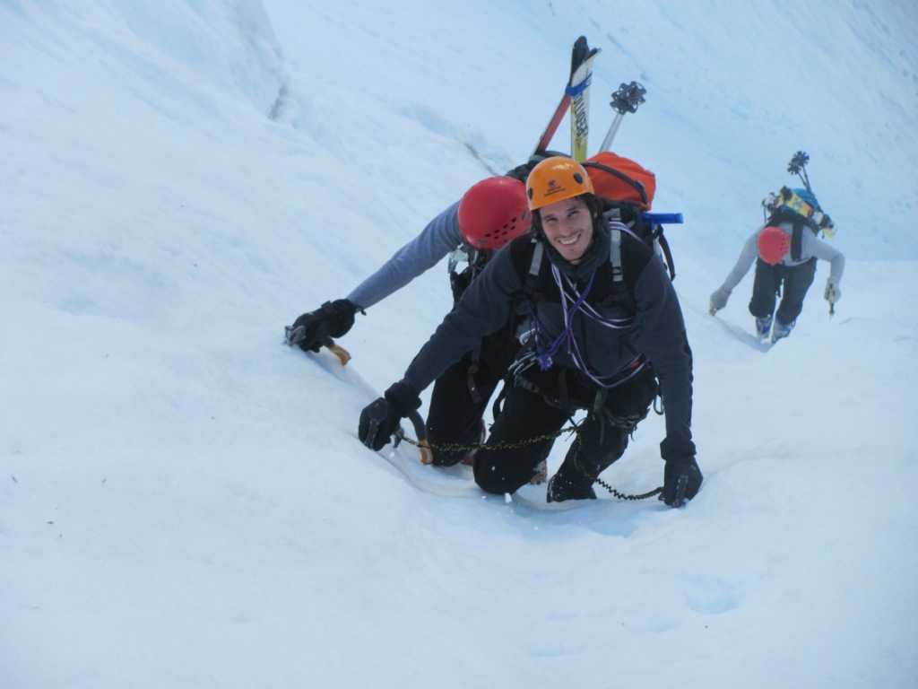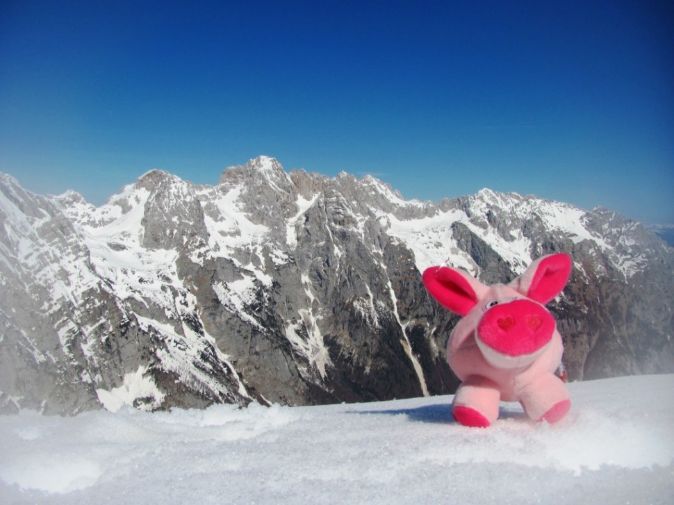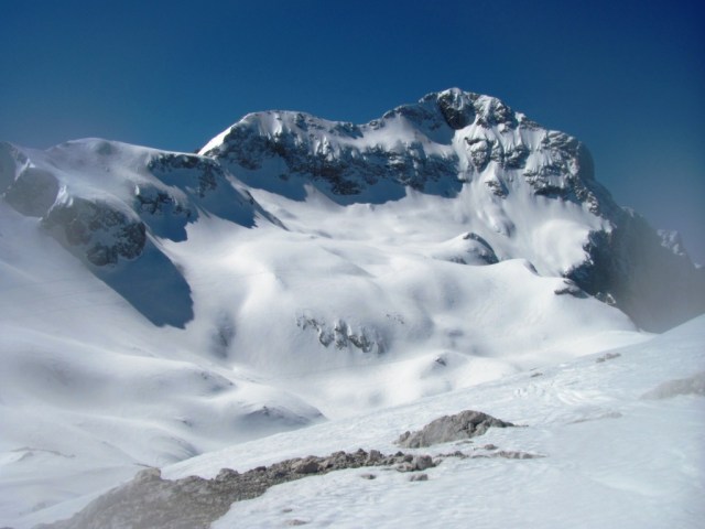Iz sence stene smo izstopili na Triglavski ledenik. Ponavadi sem vesel da vidim Sonce. Tokrat pa je tako žgalo, da sem komaj čakal da se skrijemo spet v zavetje kake sence. Nebo, obzorje, hribi – povsod brez oblačka. To so neverjetni pogledi na vse strani, če… …. če sploh vidiš! Kajti brez sončnih očal, močna sončna svetloba tako zelo slepi da oči težko držiš odprte. Na vrhu Stene smo v senci izmerili temperaturo kar kar 15 °C. Sneg je bil povsem južen. Zato nismo rinili še naprej na Triglav.