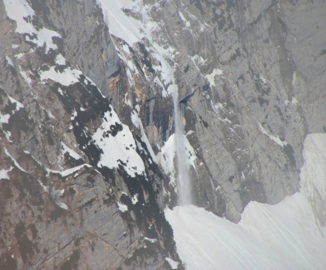 Na robu Stene smo si privoščili odmor za lepe razglede v dolino in na Triglav. Potem pa je sredi belega dne zagrmelo, in takoj za tem še enkrat še močneje. Bil je odmev snežnih plazov, ki so v obliki velikih belih slapov bobneli preko južne stene Stenarja (in še verjetno kje drugje) onstran Vrat.