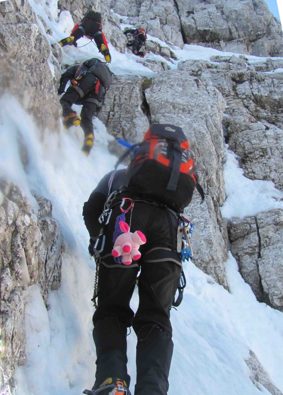 Varovanje ni potrebno, če si suveren v plezanju III. Vsekakor za vsak slučaj obvezno vzemite vrv. Takrat, ko smo mi bili je bilo nekaj dry-toolinga. Mislim pa da je ponavadi smer v celoti zalita. Mi smo za smer potrebovali 2 h 15 min. Povprečen gornik verjetno potrebuje 3 – 4 ure.