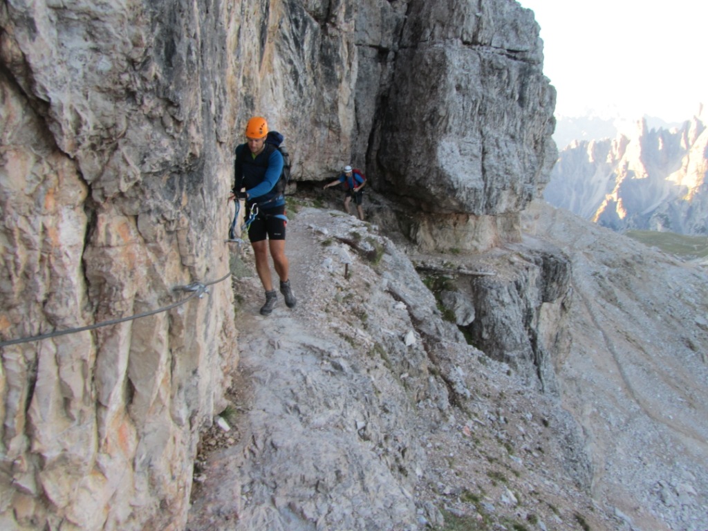 Začetek poteka skozi kaverne iz prve svetovne vojne. Na nekem mestu je tunel celo tako nizek da je potrebno iti kar po kolenih. Za tem pa je sledil sprehod po poličkah čez steno s katerih je ves čas izjemen razgled na Cine. Edino kar me čudi, da je pot označeno zelo slabo glede na to da po tej poti vsak dan hodi na stotine ljudi. Obledele markacije sicer so. Nikjer pa ni nikakršnih napisov kam (niti v italijanščini) kam naj bi katera izmed poti vodila. Po grapi smo se vzpeli do škrbine Comoscio. Tu pa smo zavili levo na ferato proti vrhu gore Monte Paterno. Ferata ni težka in je zelo kratka. Vseeno brez samovarovanja ne bi imel dobrega občutka. Kmalu se ferata razcepi na dva kraka, ki pa sta oba približno iste težavnosti. To verjetno zato da se gre v primeru gneče po enem kraku gor in po drugem dol. Z vrha ferate sledi le še nekaj minut hoje po skrotju do vrha gore. Razgled z vrha je seveda fantastičen.