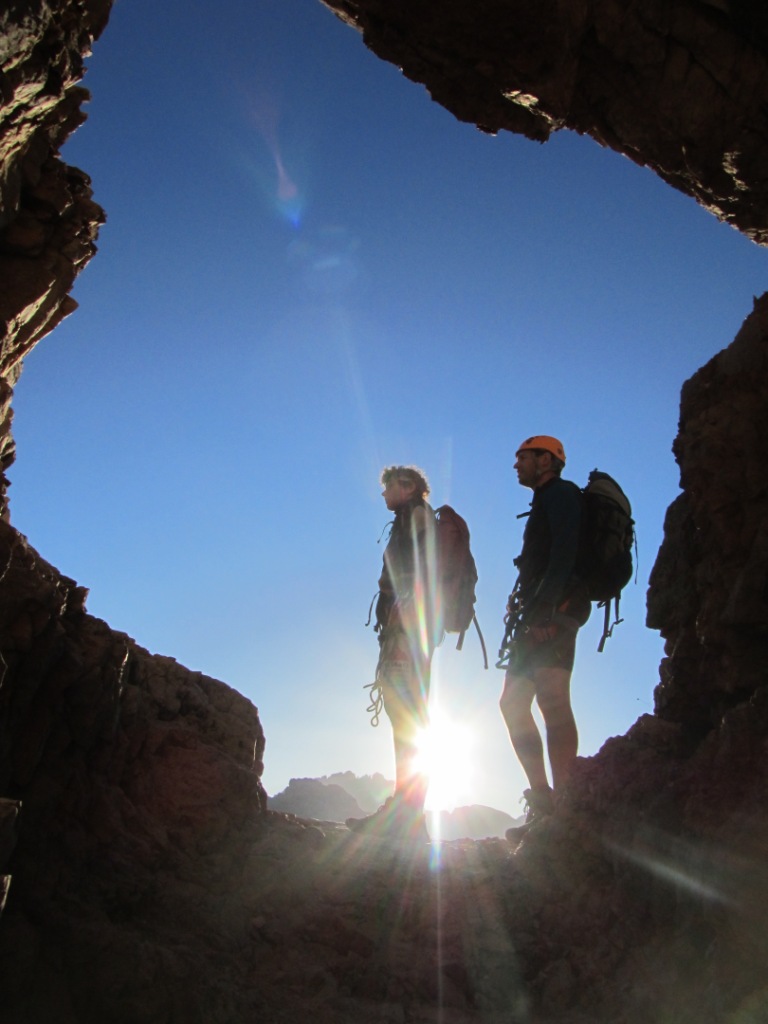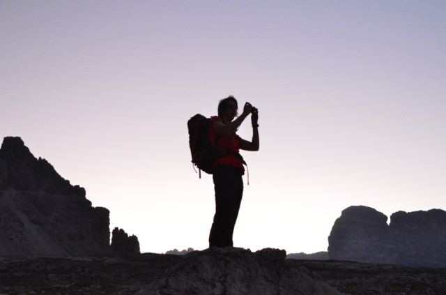 V jutranjem svitu smo se  odpravili proti koči Lavaredo. To ni bil nikakršen vzpon in niti ga nismo jemali tako, saj je bilo treba premagati vsega 15 metrov višinske razlike. Vendar smo med tem uživali v pogledih na obrise ostro našpičenih okoliških vrhov. Komajda smo čakali da se vsaj toliko zdani, da bomo lahko začeli fotografirati. S koče smo se vzpeli na sedlo Lavaredo med Malo Cino in goro Passporto s koder smo že lahko videli del severne stene Treh Cin.