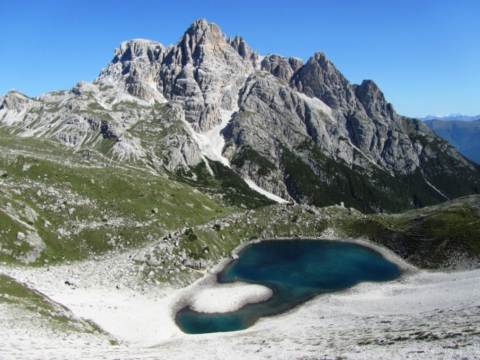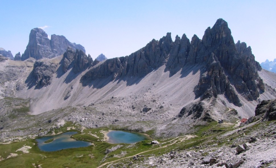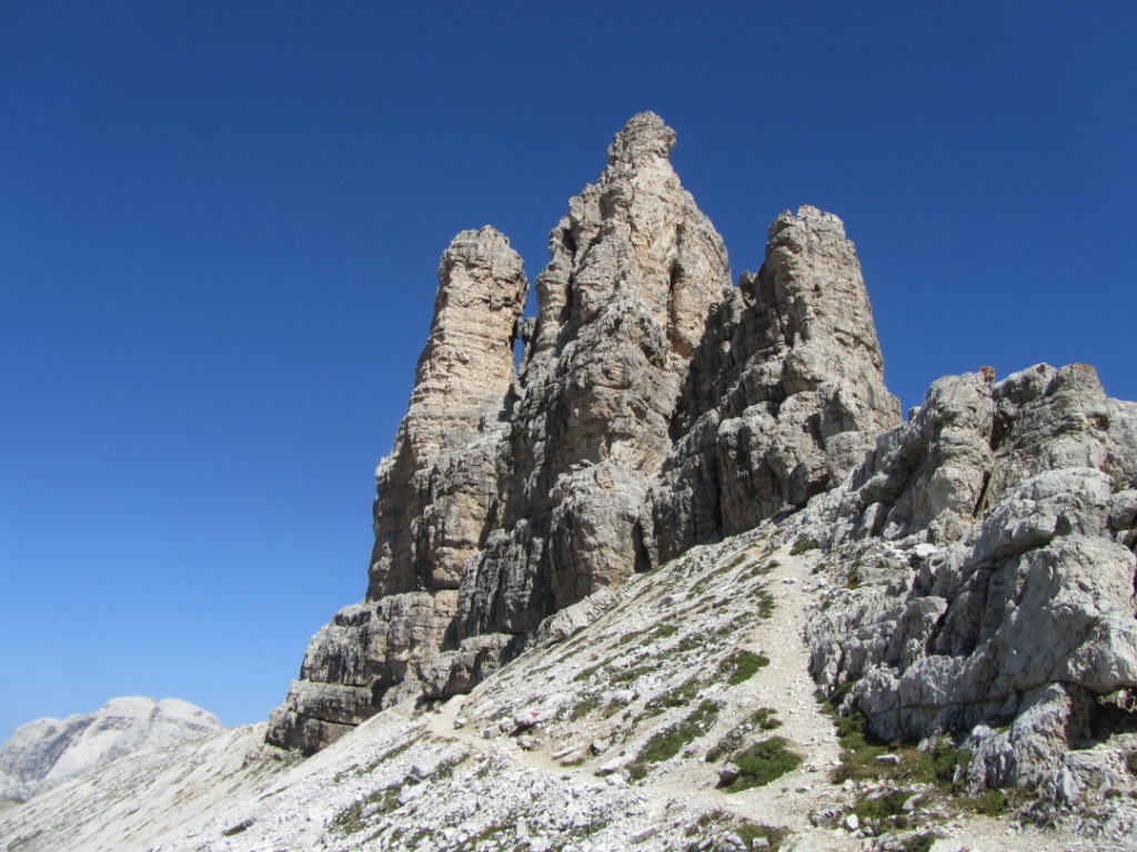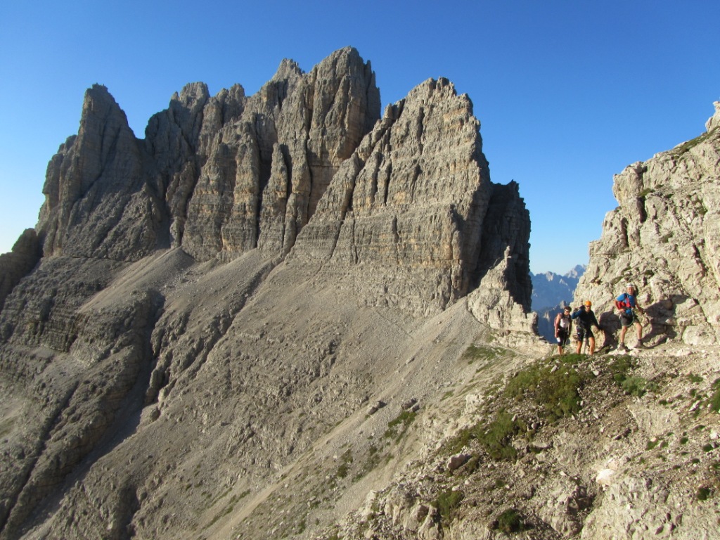 Tu smo zavili desno na pot na Monte Paterno. Razgled na mogočno in predvsem navpično severno ostenje Treh Cin je bil z vsakim korakom lepši. Od tu dalje sem Cine slikal vsaj stokrat. Pa še sploh nisem bil ta najbolj obsedeni s fotografiranjem izmed nas. Grega, ki mu fotografija nekaj pomeni, res ni hotel zamuditi prav nobene priložnosti za dobro fotko. Zato smo danes več fotografirali in gledali razglede, kot pa hodili. Poleg tega pa je bilo vreme res pravo. Skupno smo naredili kar okrog 1500 fotk.