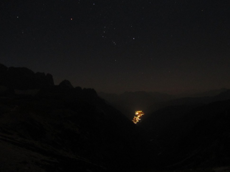 Tako smo se že ob polnoči štirje kameradi odpravili proti Italijanskim Dolomitom. Nočna vožnja je minila presenetljivo mirno, navkljub močno povečanemu prometu na cesti zaradi vrhunca turistične sezone. Na parkirišči pred kočo Auronzo smo bili že ob pol petih zjutraj. In bila je tema! Tako zelo temno pri nas nikjer ni zaradi tega ker je slovensko nebo drugo najbolj svetlobno onesnaženo nebo v Evropi. V minutah preden se je na vzhodu začelo svitati, smo lahko uživali v pogledu na mogočno impresijo Rimske ceste v kateri sta kot svetli megleni lisi izstopali zvezdni kopici NGC 884 in NGC 869. Nad vzhodnim obzorjem je viselo ozvezdje Oriona v katerem se je videlo meglico M 42. Pri nas se jo vidi redko. Seveda pa ne morem mimo vedno navdušujočih Koscev (M 45) in pa planetov Marsa in pa Jupitra, ki sta bila (sploh slednji) že skorajda moteče svetla. Ob teh pogledih mi je bilo zelo žal da nisem imel teleskopa s seboj. Mogoče pa ste že vseeno pomislili da sem že skorajda pozabil na astronomijo. Vendar, ne! Še vedno z užitkom vsak dan zelo natančno spremljam astronomsko dogajanje ter občasno opazujem nočno nebo. Konec koncev bo pa tudi moja diplomska naloga imela skorajda več skupnega z astronomijo, kot z geologijo.