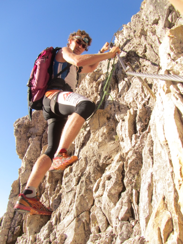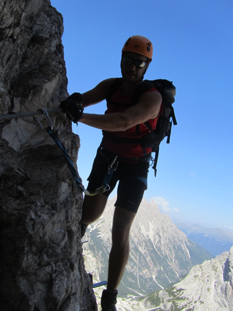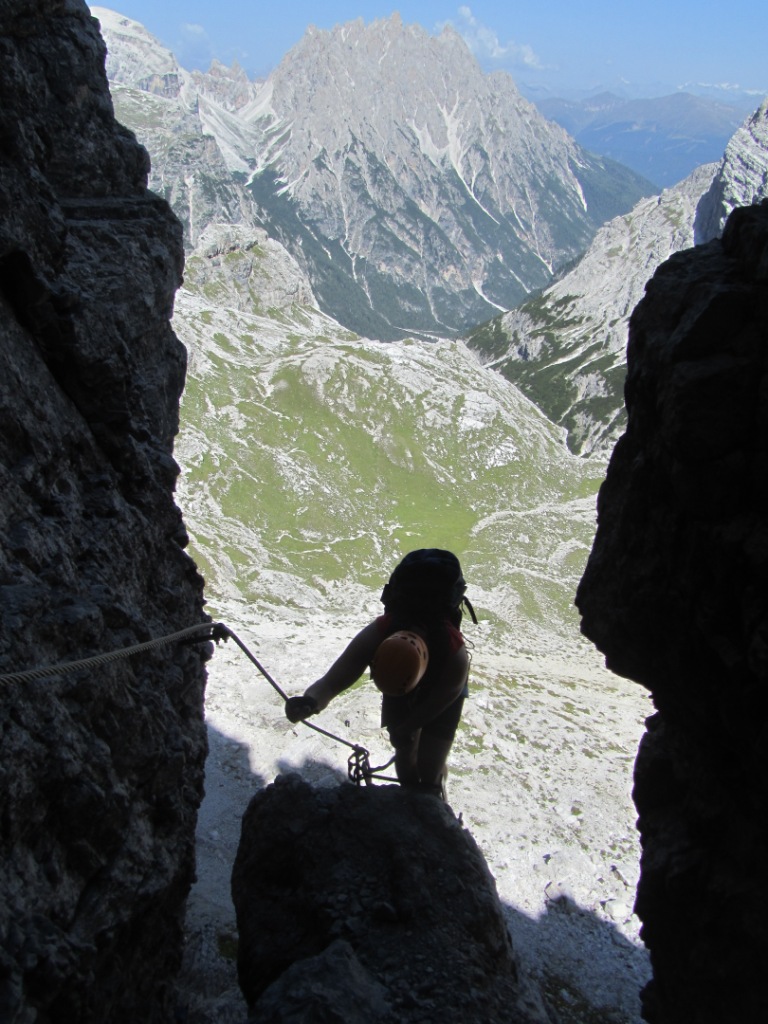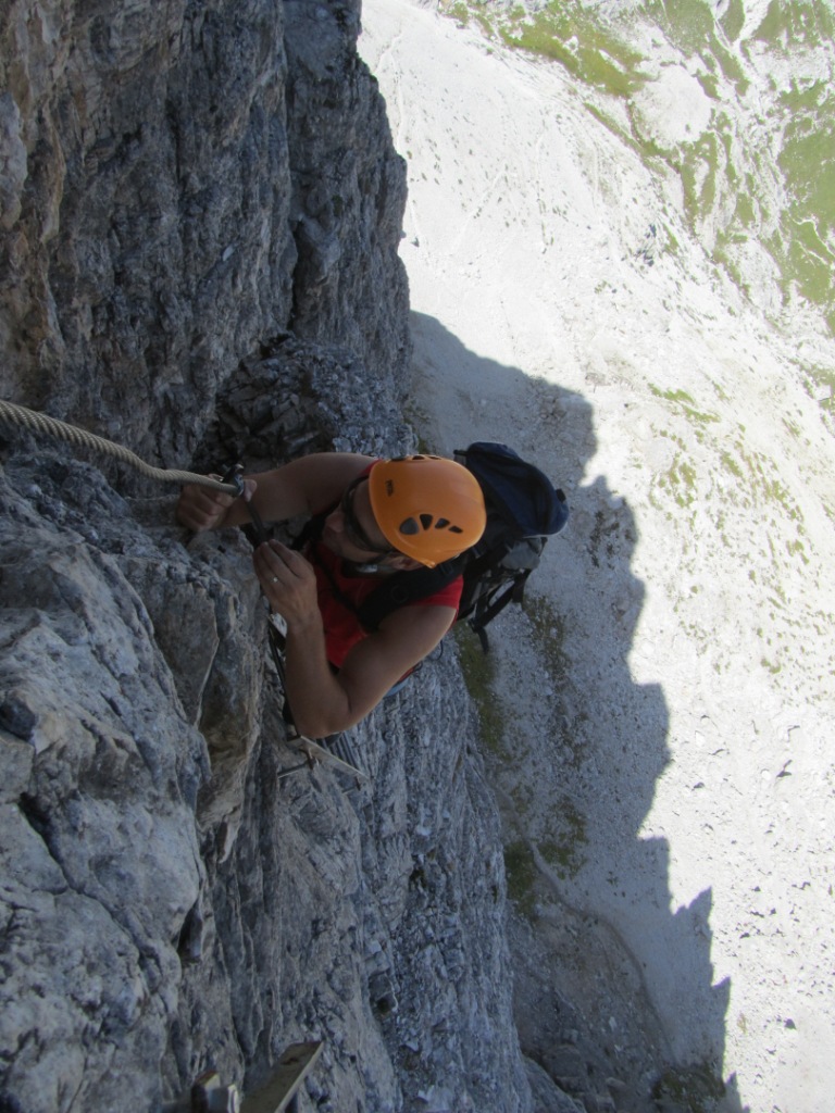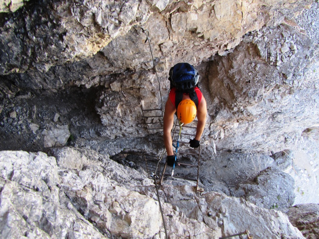 Od tu naprej smo šli vsak po svoje. Midva z Gregom sva se odpravila na Torre di Toblin, medtem ko je Cveto šel laufat okrog Cin.  Glede na gnečo pri koči sem pričakoval da bo vzpon po ferati via delle Scalette na Torre di Toblin bolj podoben dolgem čakanju v vrsti pred atrakcijo v zabaviščnem parku. Pa na srečo ni bilo tako. Še zdaleč nisva bila sama, a hodila sva lahko nemoteno. Vseeno pa sem bil glede na vse lahke in nič kaj feratarske ferate, ki sem jih že prehodil danes, presenečen nad njeno težavnostjo. Pot poteka prek 17-ih jeklenih lestev, ki si sledijo druga za drugo. Večino časa se vzpenjamo po strmem žlebu, kjer smo v milost in nemilosti tega koliko kamenja bo kdo sprožil na nas.