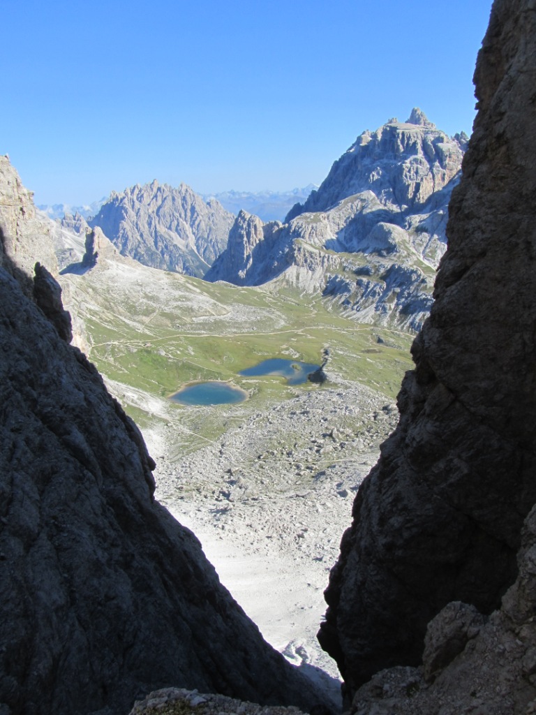 Po ferati smo se vrnili nazaj do škrbine. Tu pa smo zavili desno na ferato de Luca. Pot, ki gre naravnost na drugo stran škrbine pa gre skozi tunele pot proti koči Locatelli. Seveda tudi ferata de Luca še zdaleč ni nič kaj težkega. Samovarovanje priporočam samo za boljši občutek ob fotografiranju. Drugače pa ni potrebno. Pot prečka tudi mostiček s katerega je lep razgled na jezeri Laghi di Piani. Za tem smo nadaljevali proti škrbini Forca dei Laghi. Tu pa smo zapustili pot proti koči Pian di Cegnia in se po super meliščih spustili proti najnižje ležečemu (2200 m) izmed jezer skupine Laghi di Piani. S tod pa smo nadaljevali proti koči Locatelli. Do tu smo bili skorajda sami. Pri koči pa se je začela tako obupna gneča, ki jo iz niti naših najbolj obljudenih hribov ( Triglava) nisem vajen. Grozno!