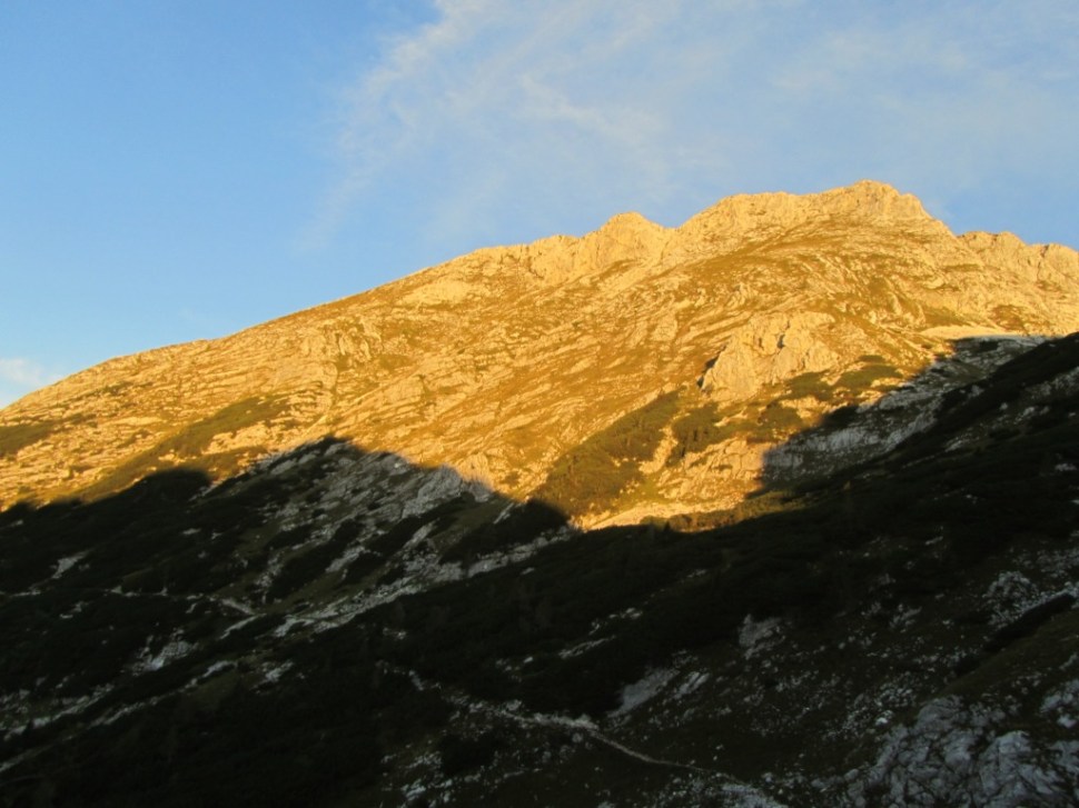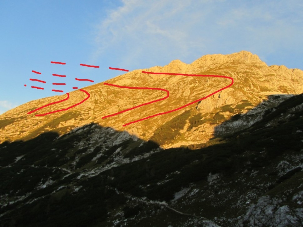 Midva sva začela še v trdi temi na Rudnem polju in prek Studorskega prevala po “magistrali” pod Toscem dostopila na Velo polje. S tod pa sva nadaljevala proti sosednji planini z zelo “izvirnim” imenom Pod Mišelj vrhom. Planina je opuščena, a s svojimi čudovitimi planšarskimi stajami zelo zanimiva. S planine se že vidi lovsko pot, ki preko strmega žlebu vodi v Mišeljsko dolino. Na lovsko pot se sicer lahko podamo že kar na planini. Lahko pa po označeni poti proti Mišeljskemu prevalu nadaljujemo še nekaj minut. Potem pa nas možici usmerijo desno na brezpotje, ki se kmalu spremeni v uhojeno pot.