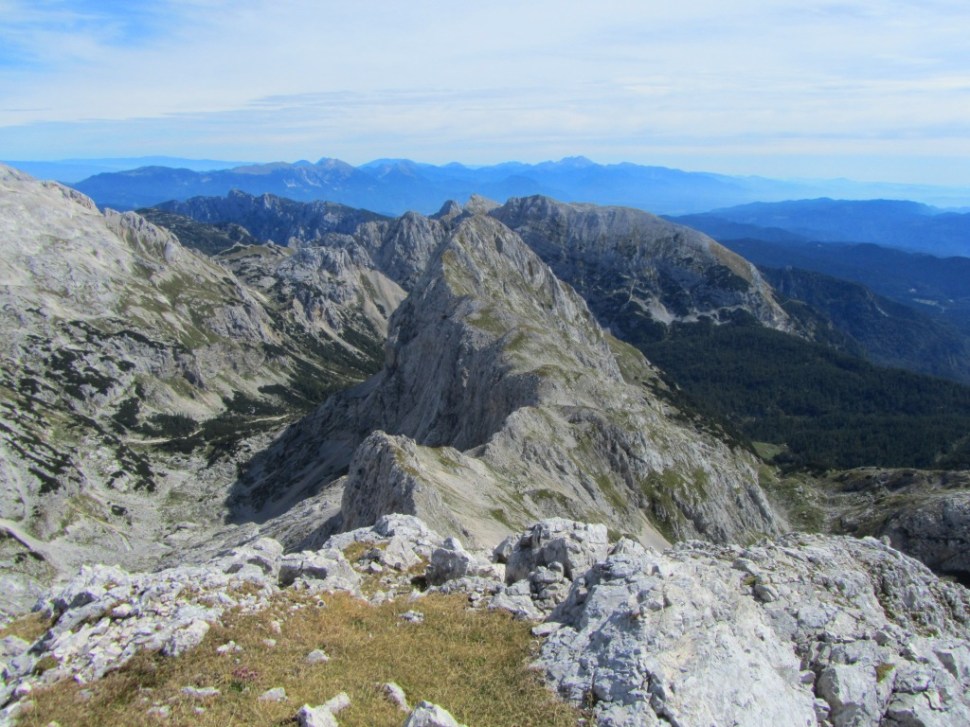 Z grebena sva brez težav povzpela na Mišelj vrh. Edino kar je motilo najino brezpotno samoto, je bilo nenehno hrumenje helikopterja, ki je letal gor in dol po Velski dolini. Letel je na relaciji Rudno polje- Dolič. In to najmanj 10 krat. Verjetno zato, ker je dostavljal vse potrebno za novo kočo na Doliču. Mišelj vrh je res pravi razglednik in ponuja odprte razglede na vrhove nad Fužinskimi planinami ter na Triglavsko skupino. Zadeve sem natančno poslikal saj mi te fotografije zanjo proti prav pri načrt0ovanju katere izmed naslednjih (brezpotnih) tur.