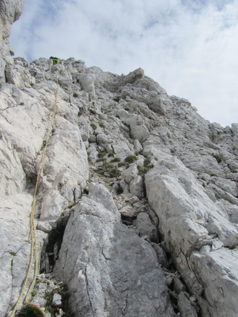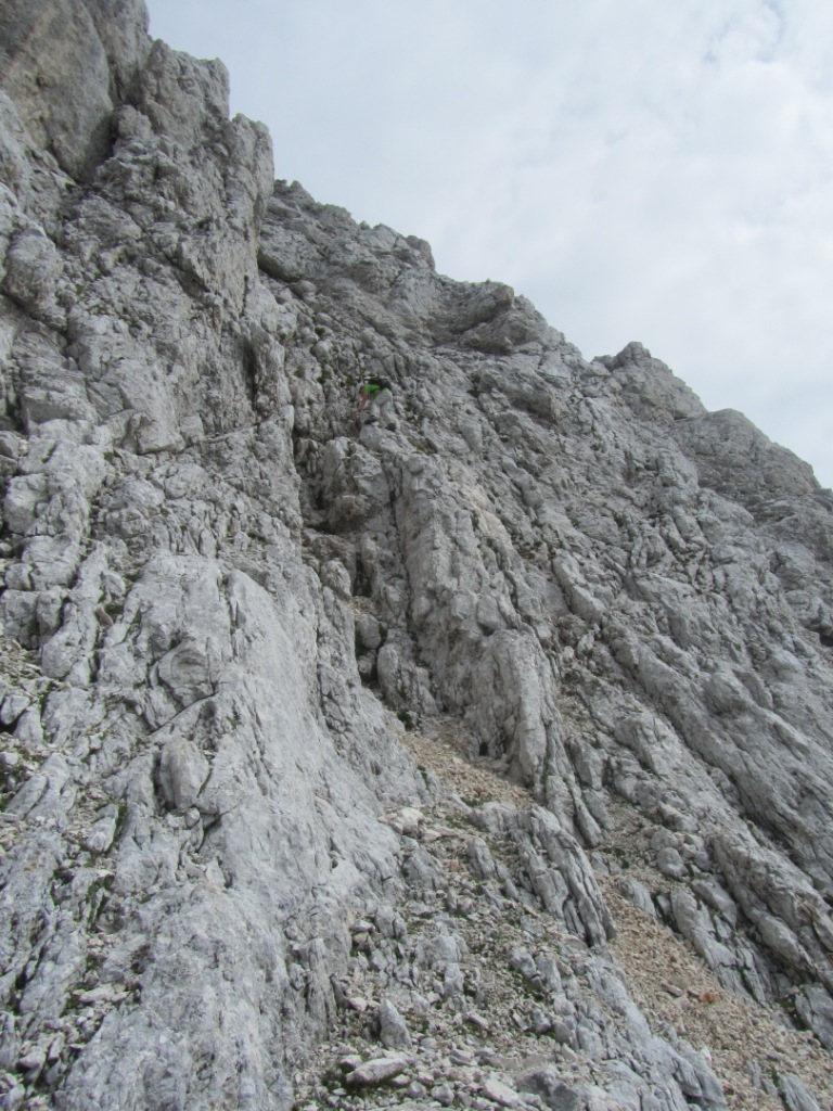 Z vrha sva nadaljevala še naprej po grebenu proti Hribaricam. Takoj vzhodno od vrha se spustimo v grapo in po njej zavijemo levo. Grapa je zelo podrta in krušljiva. Zato zahteva izrazito pazljivost. Čez nekaj časa grapo strm skok razdeli na dva dela. Erazem se mu je izognil po levi strani. Sam pa sem čez kar abzajlal. Na srečo sem s seboj nosil 30 m dolgo vrv. To je ravno zadoščalo da sem se spustil na manjšo poličko, kjer sem našel spet dober skalen rogelj okoli katerega sem lahko naredil še en abzajl. Tako sem se z dvema abzajloma po 15 m spustil čisto do melišča pod steno. Erazem pa je brez varovanja previdno splezal navzdol. Težave so le okrog II, a je zelo krušljivo.