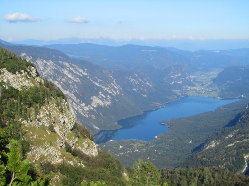 S Črnega jezera sem nadaljeval proti Komni. Sprva se pot še nekaj višinskih metrov vzpne. Potem pa sledi dolg sprehod po robu planote nad Komarčo v nenehnih spustih in vzponih. Vmes pa se za vzpodbudo pojavi nekaj odličnih razgledov na Bohinjsko jezero. s Komne sem nadaljeval proti Bogatin potem naprej na Lepo Komno. V nasprotju s skorajda hotelskim turizmom v neposredni okolici Doma na Komni, je planota Lepa Komna odmaknjen raj. Pot poteka skorajda naravnost po lepi ozki stezici ves čas v rahlem vzponu in v čudovitih razgledih na zanimivo in pa zelo razgibano pokrajino. Težko bi se človek uprl teku pa tako udobni poti. Po drugi strani pa me je večkrat premamilo udobje toplih mehkih trav, da sem za trenutek posedel v njih in si v svojo beležko zapisal kako podrobnost ali utrinek s poti. Vreme je bilo čudovito in če bi bil zares utrujen bi v teh travah z lahkoto zadremal. Tako pa me je nekaj gnalo še naprej. Nadaljeval sem po stezici prek ostankov mulatjere na Lanževico. To je 2003 m visok, redko obiskan kopast vrh, ki se položno dviga nad Komno. Kljub skromni višini pa je bil razgled čudovit v vse smeri, saj daleč naokoli ni visokih gora, ki bi zakrivale razgled. Sem gor sem tekel tudi letos pozimi. Vzpona prav na vrh pa mi nista preprečila niti blazen mraz in vihar, ki sta takrat vladala, ampak megla. Vendar pozimi je to povsem drugačen svet sestavljen iz samih med seboj na las podobnih kopastih kuclov, v katerem človek (sploh v megli) hitro popolnoma izgubi orientacijo.