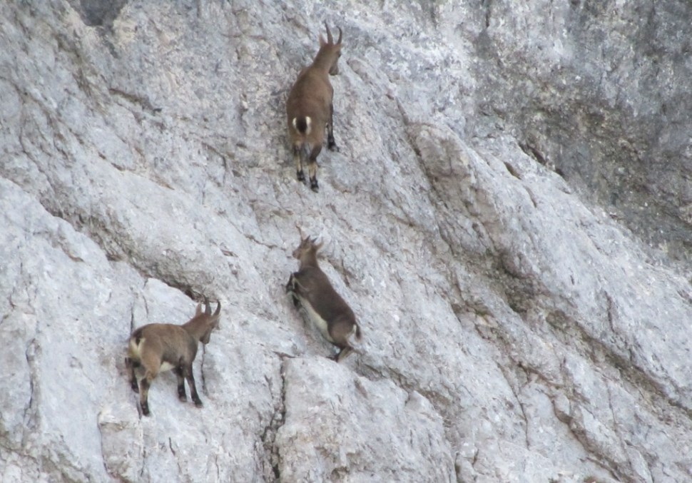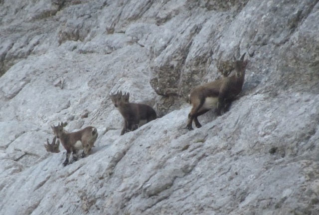 Med prečenjem melišč sem užival v pogledih na čredo kozorogov in gamsov. Najbolj me je presenetilo kako te živali plezajo čez strmo steno. Še jaz ne bi upal tam prečiti polic, kjer so jih z veliko lahkoto to kozorogi. Skratka te živali me vedno navdušijo, ker so tako ljubke. Nadaljeval sem po zoprnem melišču v žleb pod Pihavcem. Tu sem si za trenutek oddahnil. Pa ne zato, ker bi bil utrujen od melišča, ampak kjer je bilo to edino zavetje pred skorajda neznosnim vetrom. Po skobah sem se povzpel iz žleba in potem po lažjem terenu na južni strani gore do vrha. Veter je bil na vrhu gore še posebej močan. Zato sem hitro sestopil, čeprav je bil razgled odličen. Razgledal sem se ravno toliko da sem približno določil nadaljnje poti.