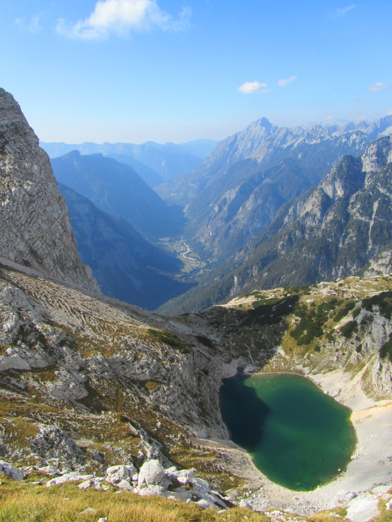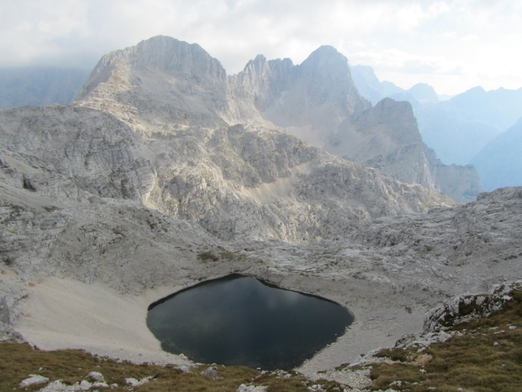 Kriški podi s zgornjim jezerom v ospredju ter grebenom Bovškega Gamsovca, Pihavca in Šplevte v ozadju.