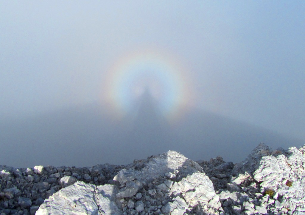 Naslednje kar mi je prišlo na misel je bilo to da bi kar po grebenu nadaljeval proti sosednjemu Kriškemu robu. Žal je bil to neuspešen poskus (ekstra višinci), ker ko sem prišel bližje  videl, da mora biti to plezanje vsaj III ali IV stopnje težavnosti. Brez vsakršne plezalne opreme seveda ni bilo smisla riniti dalje. Vseeno pa mi ni bilo treba sestopiti prav nazaj do Pogačnikovega doma. Pri veliki luknji (že skorajda jami), ki se jo vidi že od daleč s Šplevte, sem zavil levo in kmalu dospel na markirano pot proti Bovškim vratcem. Veter končno nekoliko poneha, kar mi vlije nekaj dodatne motivacije za še zadnji današnji klanec proti Križu. Na vrhu te gore sem bil letos že trikrat. Zato sem šel  čez ta podolgovat vrh mirno in brez ustavljanja kar naprej proti Stenarskim vratcem. Sem pa malo pod vrhom videl glorijo. To je zanimiv atmosferski optični pojav, ko senco človeka v megli obda nekakšna okrogla mavrica. Ta čudovit in redek pojav sem videl šele drugič. Pojav še ni povsem pojasnjen. Najverjetneje pa je posledica povratno sipane svetlobe z vodnih kapljic v megli. Do pojava pride le če je megla pod opazovalcem in vir svetlobe (Sonce) direktno za opazovalcem.