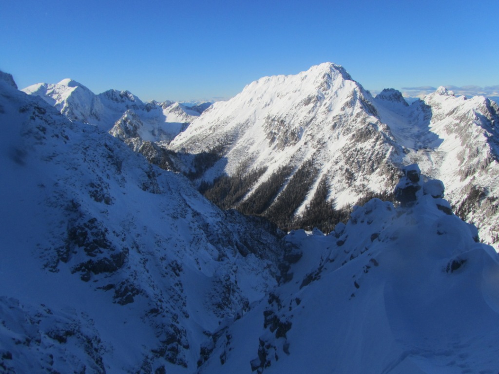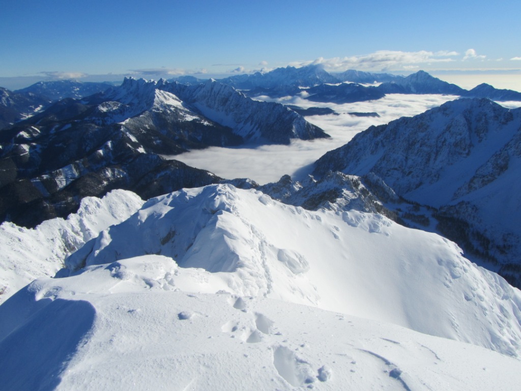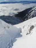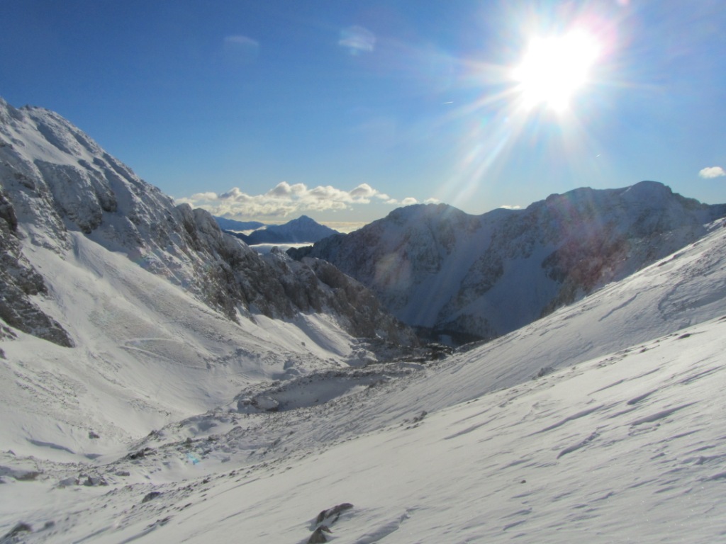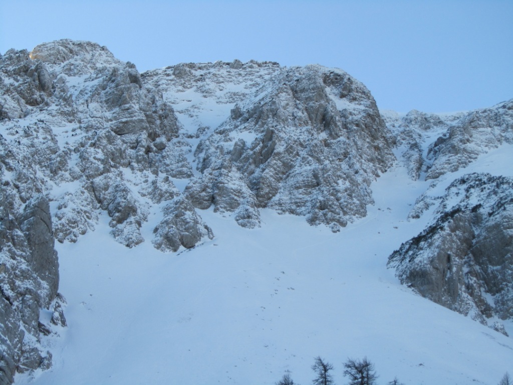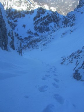 Nekaj časa sem brez težav nadaljeval. Potem pa se je grapa razcepila na dva kraka. Najprej sem šel pogledati desno. Vendar sem kmalu odnehal, ker ni bilo videti lepega nadaljevanja. Zato sem še drugič sestopil in nadaljeval levo navzgor. Precej položna grapa me je pripeljala na rampo brez pametnega nadaljevanja. Možno smer sem videl  še nekoliko bolj levo. Zato sem prečil levo navzdol in potem spet navzgor. Po 20 min sem bil spet v slepi ulici. Nadaljevanje se je ponujalo še bolj levo v obliki poličke, ki je bila le narahlo poprhana s snegom. “Tja čez pa ne grem brez varovanja,” si rečem in obrnem. Bil pa sem na višini ca. 1950 m.  Torej le kakšnih 50 m pod grebenom Begunjščice. Razgled tako visoko, s stene, je bil čudovit in prav nekaj posebnega. Še zdaj pa mi ni čisto jasno, kje sem zgrešil. Mogoče bila še najbolj prava tista varianta desno. Skratka ne hodite po mojih gazeh v Y, v Begunjščico. Vse tri gazi se slepo končajo. Centralna grapa pa je bila videti shojena.