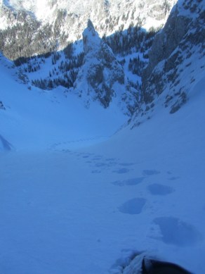 Vendar kljub vsemu sneg ni bil dober. Sneg je zelo porozen, suh in ni sprijet med sabo. Brez problema se po njem hodi. Plezanje v takem snegu pa bi bilo nočna mora. Sredi grape sem si privoščil en krajši (neobvezni) obvoz da sem splezal en kratek skokec. Vendar sem se z njim zelo namučil, saj je sneg tako zelo porozen, da vanj ni mogoče zabiti cepinov. Skok sem zato splezal tako da sem skopal luknjo v pršič, dokler nisem prišel do trdne podlage pod snegom, ki je končno dala zadostno oporo za plezanje.