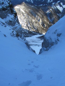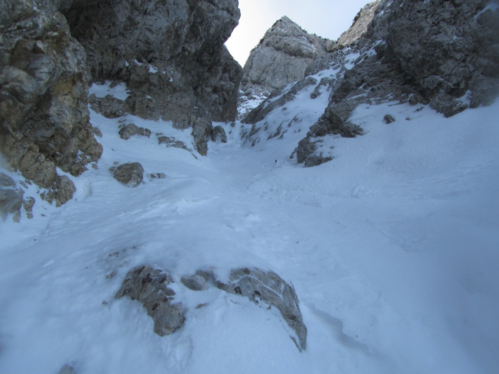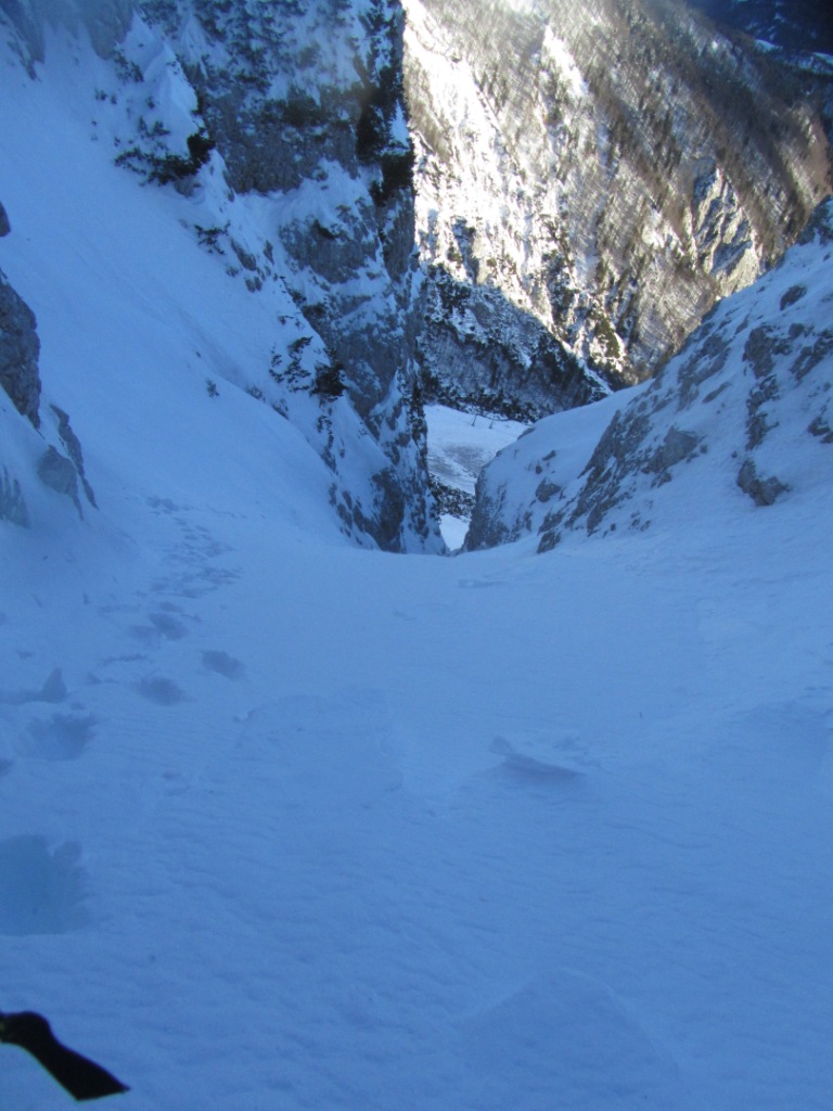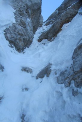 Za tem se brez težav skok obvil po levi strani in sestopil v grapo. Vzpon po grapi je bil zelo prijeten. Dejansko je to točno to kar mi je pozimi v hribih najbolj všeč. Višje se je pojavil kratek skokec, ki sem ga z nekaj previdnosti preplezal. Sledilo je še nekaj 100 metrov odličnega pikanja. Potem pa se je pojavil spet večji – s snegom poprhan skok.