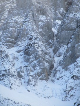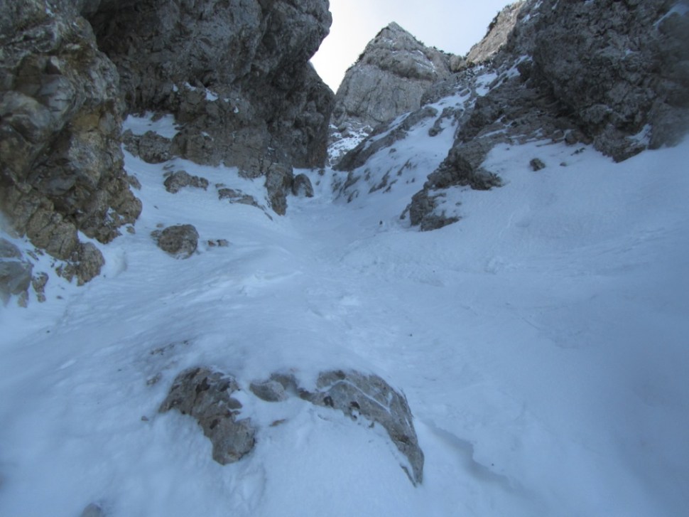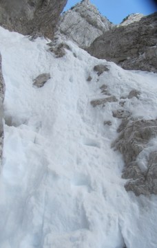 Dostop v grapo zapira začetni skok. Najprej sem poskušal po desni, pa ni šlo. Problem je v tem da so skale le narahlo posute s pršičem. Zato ni mogoče nikamor zanesljivo zabiti cepine in dereze. Brez drytoolinga ne bi šlo. Vendar sem si zabičal da bom obrnil, če naletim na skok čez katerega ne bom mogel zanesljivo splezati. To izključno iz momenta varnosti, ker nisem imel vrvi, da bi poabzajlal v primeru da ne bi našel prehoda na greben in bi se bil po grapi primoran vrniti.