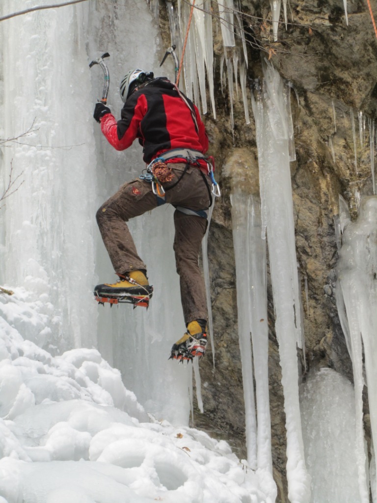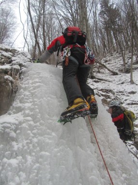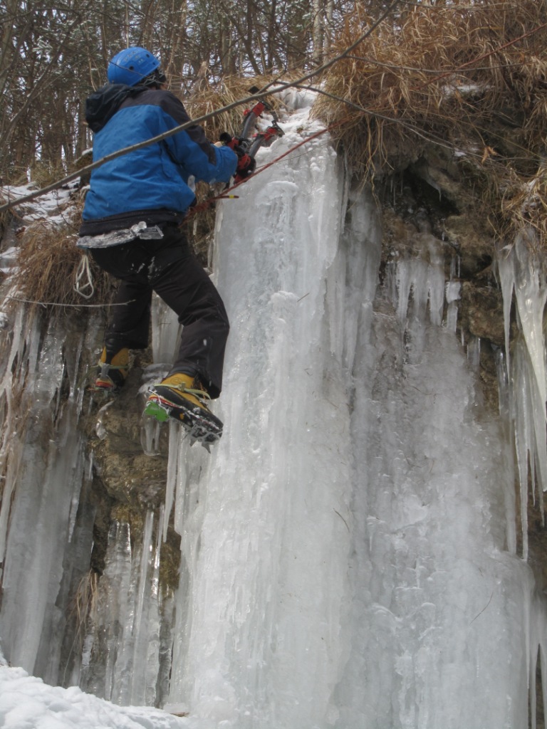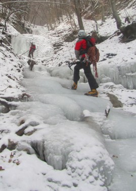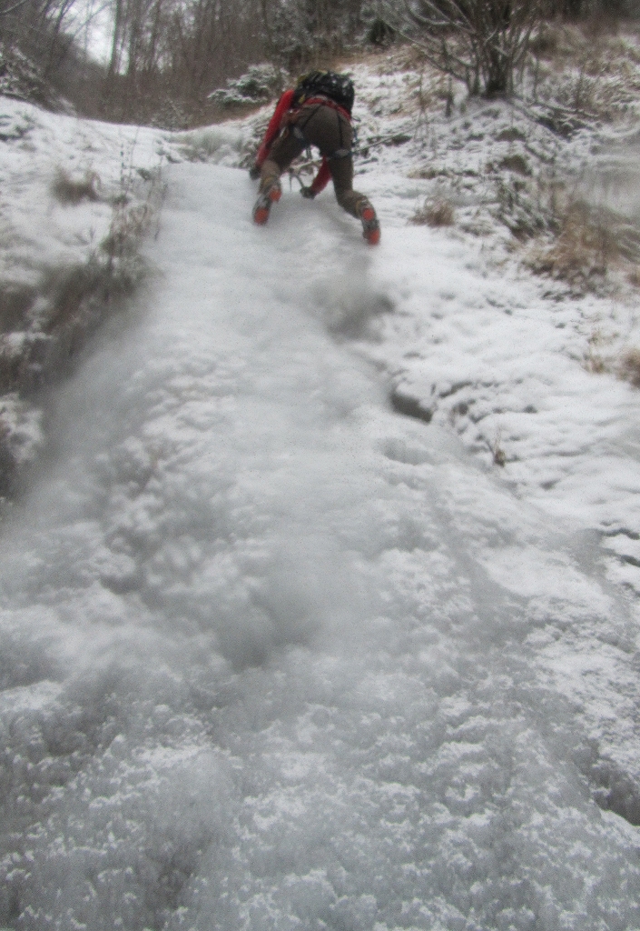 Prvi slap smo našli že kar na koncu vasi, tik ob cesti proti Jamniku. Pretok tega potočka je kar močan in zato še vedno ni povsem zamrznil. Vrhnja sveča je bila votla. Za tem smo zavili v grapo pritoka Kroparice. Grapa poteka levo od planinske poti na Vodiško planino. V spodnjem delu grape smo posolirali nekaj položnejših skokov. Višje pa smo naleteli na še pet slapov z višinami med tremi in osmimi metri. Erazem in Borut sta slapove suvereno posolirala. Sam, ki sem sploh prvič plezal naravne slapove, pa sem se raje poslužil luksuza varovanja od zgoraj. Kvaliteta ledu se je od slapu do slapu zelo spreminjala. Nekateri slapovi so ponujali zelo trd led. Pri drugih pa je bil led zmehčan kot “puter”. Voda je sicer tekla povsod pod ledom. Vendar nas ni nikjer tuširalo.