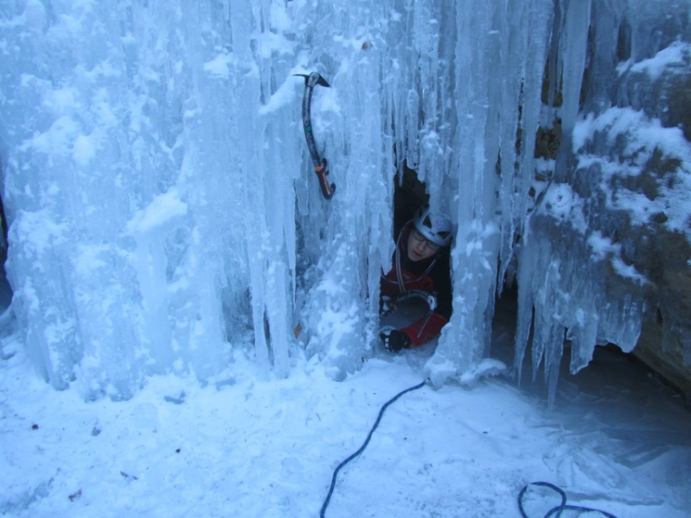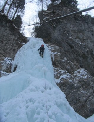 Led v tretjem slapu (18 m) je bil podoben kot v prvem- mehak in odličen za plezanje. Na vrhu slapu je še ena ca. 4 m visoka zaledenela brzica. Od tretjega slapu smo nadaljevali naprej kar po potoku proti četrtemu slapu. Seveda pa se da potoku (ki je na nekaterih mestih nesiguren) izogniti po zavarovani markirani planinski poti, ki poteka skozi celotno sotesko.